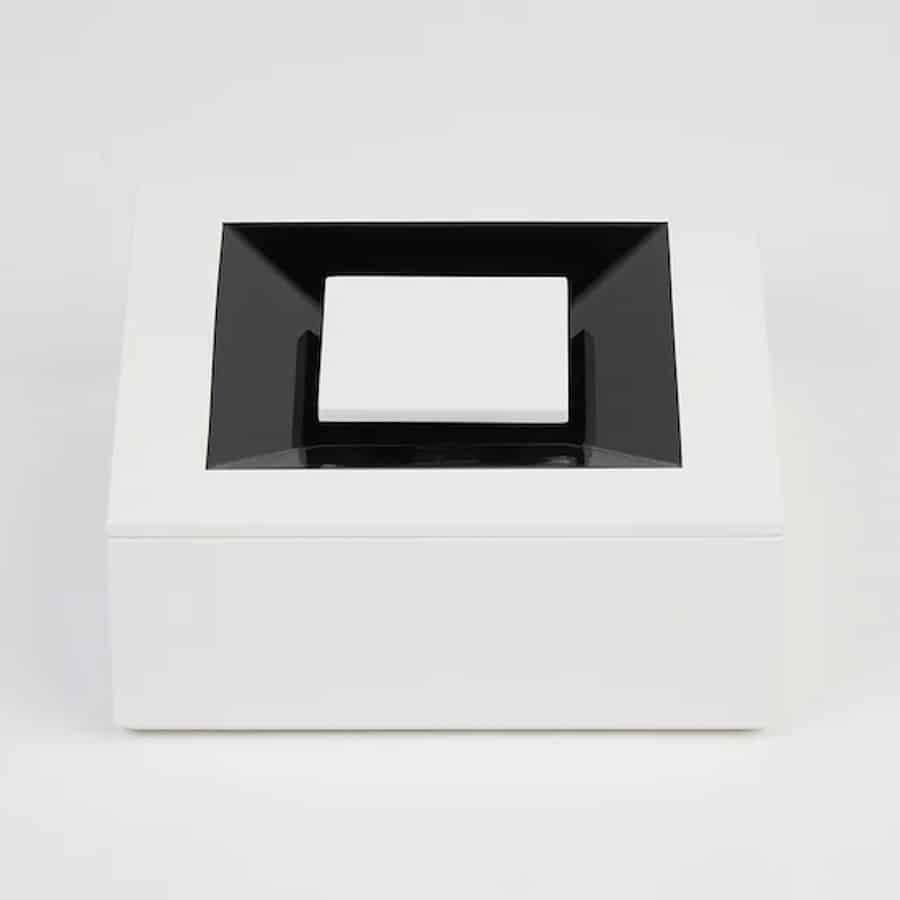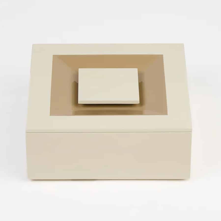 A square box defined by clarity of form and tactile precision. Its lid is resolved with a square handle, seamlessly integrated and flush with the surface, forming a gentle concave grip that invites touch while preserving the purity of the geometry.