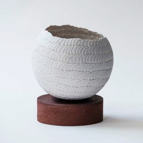 This porcelain biscuit light sculpture is formed from finely hand-applied, petal-like relief elements that gently ripple around its spherical surface. When illuminated, the thin porcelain reveals a warm, glowing translucency, casting delicate patterned shadows that bring the texture to life. When unlit, its matte white form remains calm and sculptural. The piece is grounded on a wheel-thrown plinth in natural grogged red stoneware, whose warm, earthy tone creates a striking contrast with the luminous porcelain above. Together, they form a refined, atmospheric object that celebrates material harmony, craftsmanship, and the quiet poetry of light.