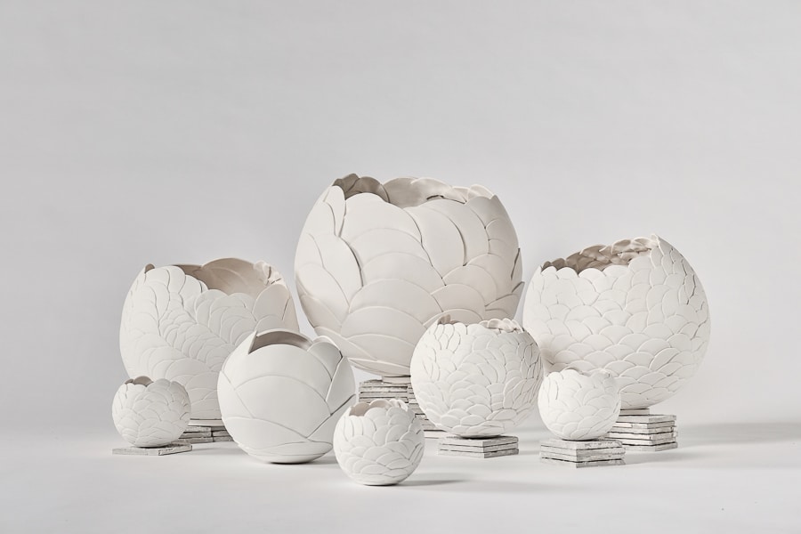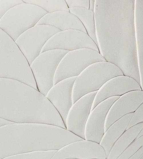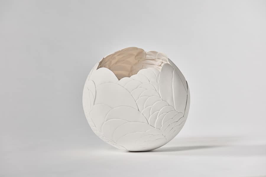 This hand-built porcelain biscuit sculpture reveals a delicate, scale-like relief that flows organically around its spherical form. Each carefully applied element creates a rhythmic, tactile surface that shifts gently with the light, giving the piece a soft, sculptural depth. Matte and luminous, the open vessel invites a quiet sense of movement and purity, showcasing the finesse of porcelain in its raw state.