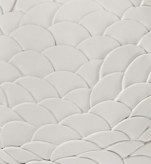 This hand-built porcelain biscuit sculpture reveals a delicate, scale-like relief that flows organically around its spherical form. Each carefully applied element creates a rhythmic, tactile surface that shifts gently with the light, giving the piece a soft, sculptural depth. Matte and luminous, the open vessel invites a quiet sense of movement and purity, showcasing the finesse of porcelain in its raw state.