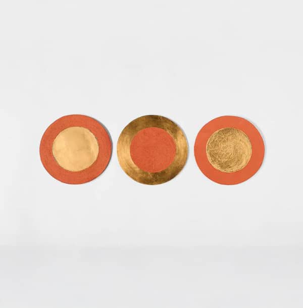 Triptych wall sculpture in bisqued red grogged earthenware, composed of three circular elements arranged in a rhythmic horizontal sequence. Each piece plays with the contrast between terracotta and 23 carat gold leaf, alternating gilded centres and gilded perimeters to create a balanced, luminous composition.