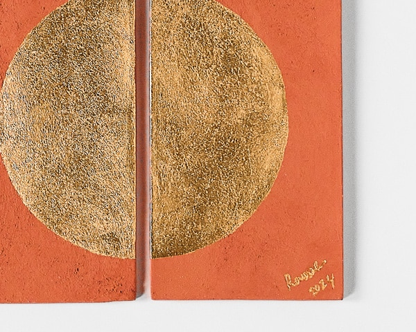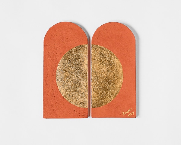 Diptych wall sculpture composed of two softly arched panels in bisqued red grogged earthenware. A central circular form, gilded with 23-carat gold leaf, is divided across the two pieces, creating a balanced, luminous composition with warm, tactile contrast between clay and metal.