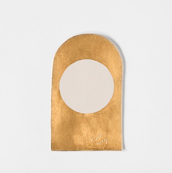Wall sculpture in porcelain biscuit, centred around a circular form framed by a softly arched silhouette. The surrounding surface is gilded with 23 carat gold leaf, creating a refined contrast between matte porcelain and radiant metallic glow. A minimal, architectural composition with quietly celestial undertones.