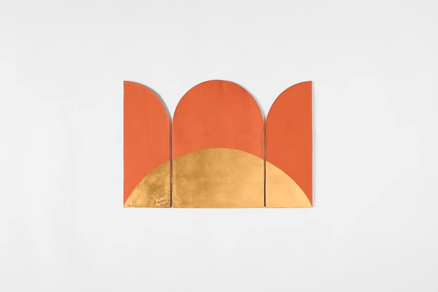 Triptych wall sculpture in bisqued red grogged earthenware, composed of three softly arched panels forming a warm, architectural silhouette. A sweeping semi-circular motif in 23 carat gold leaf anchors the composition, creating a radiant horizon-like effect across the terracotta tones.
