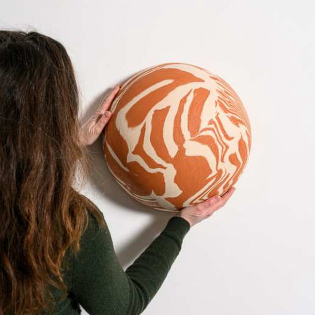 Sculpture or wall-mounted piece formed from red and white grogged earthenwares. The two clays are hand-layered and shaped to create a naturally marbled surface, where flowing strata of colour reveal the movement of the hand gestures.
