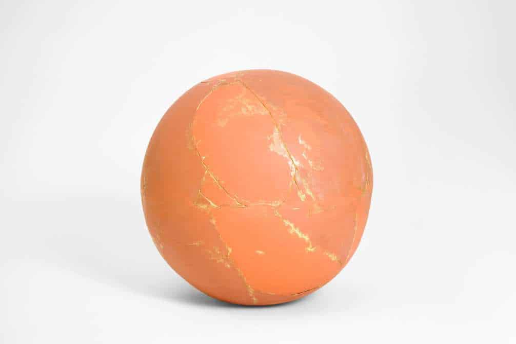 Sculpture in red earthenware and red grogged earthenware, accented with fluid gilded traces in 23 carat gold leaf. Subtle shifts in texture and tone animate the surface, giving the sphere a quiet, organic luminosity.