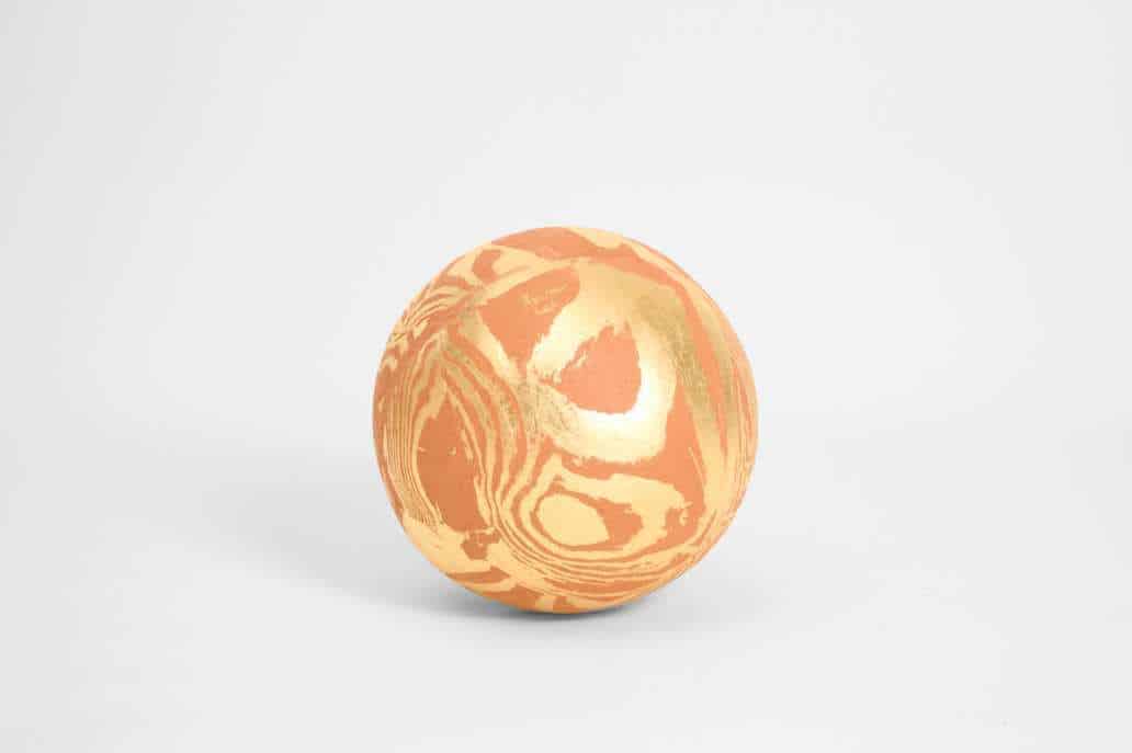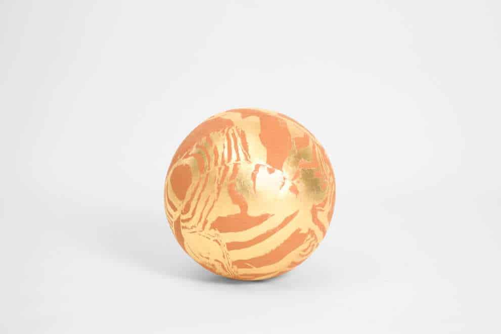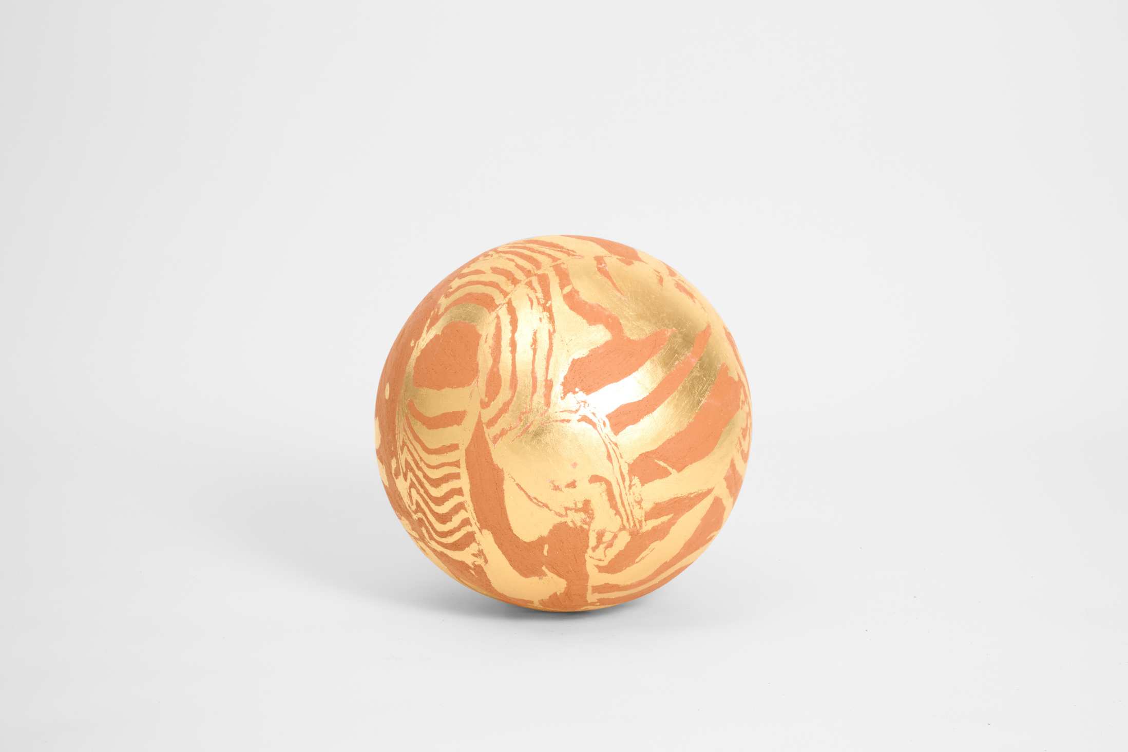 Sculpture formed from red and white grogged earthenwares, their naturally layered clays creating a flowing marbled pattern across the surface. The sphere is then gilded with 23-carat gold leaf, which settles into the contours of the clay and catches the light with soft, shifting reflections. The contrast between matte earthenware and luminous gold gives the piece a celestial presence, highlighting the artist’s interplay between raw materiality and refined finish.