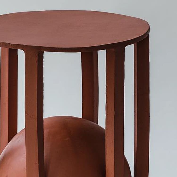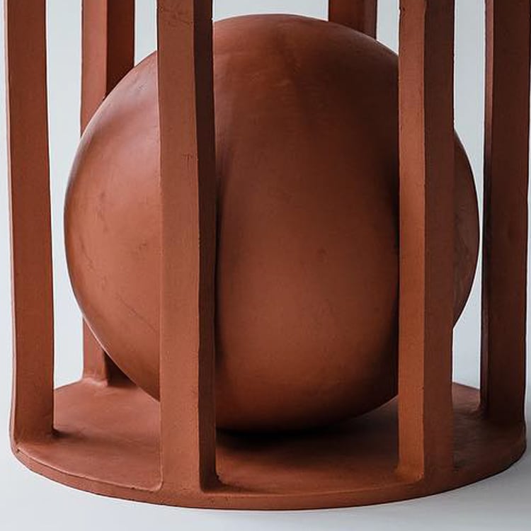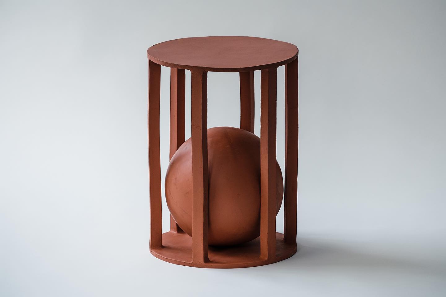 This sculptural pedestal side table is crafted from bisqued red grogged earthenware, its tall open structure encasing a central spherical form. The surfaces are burnished with beeswax, enhancing the warm, earthy depth of the clay while preserving its natural matte sheen.
