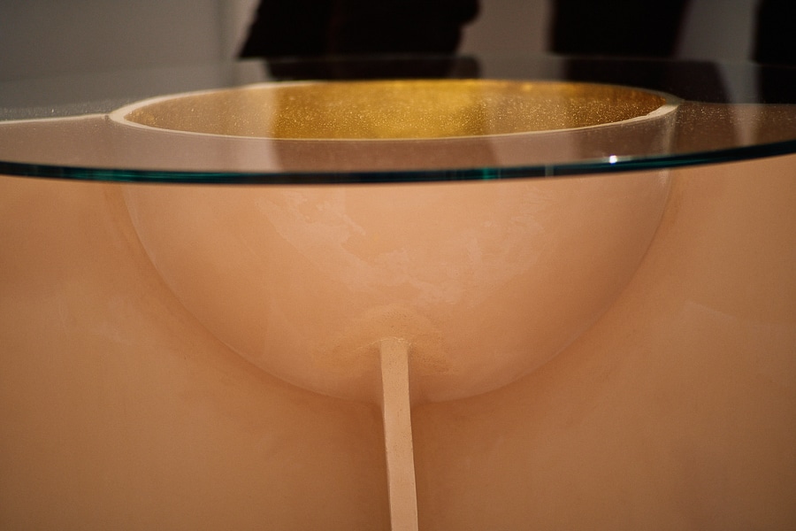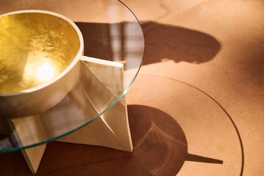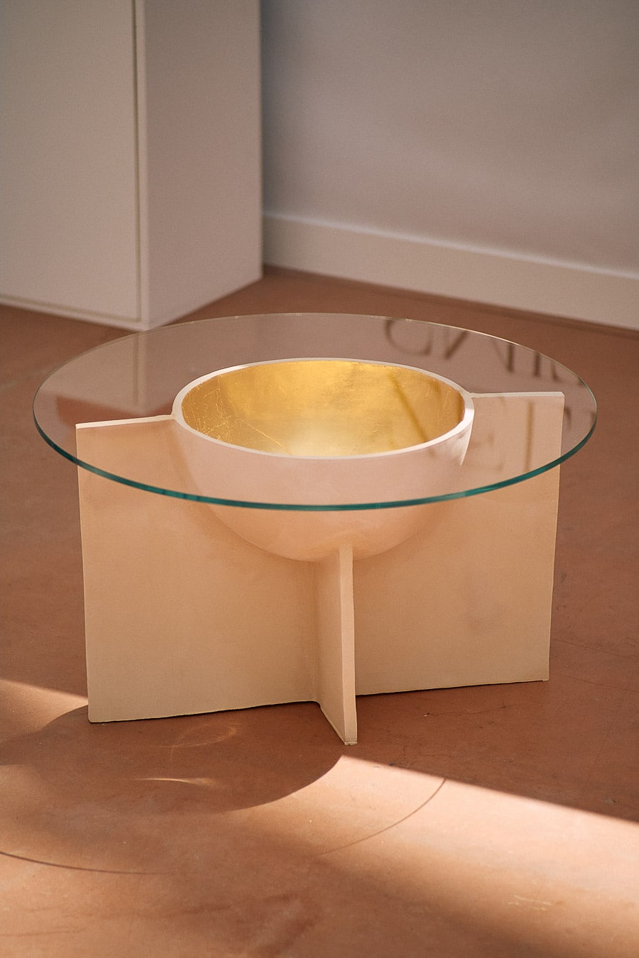 The structure supports a circular tempered extra-white glass top, offering a clear view of the luminous gold interior and the intersecting planes beneath. Both functional and expressive, the piece stands as a contemporary artefact where clay, light, and gold converge in a refined sculptural presence.