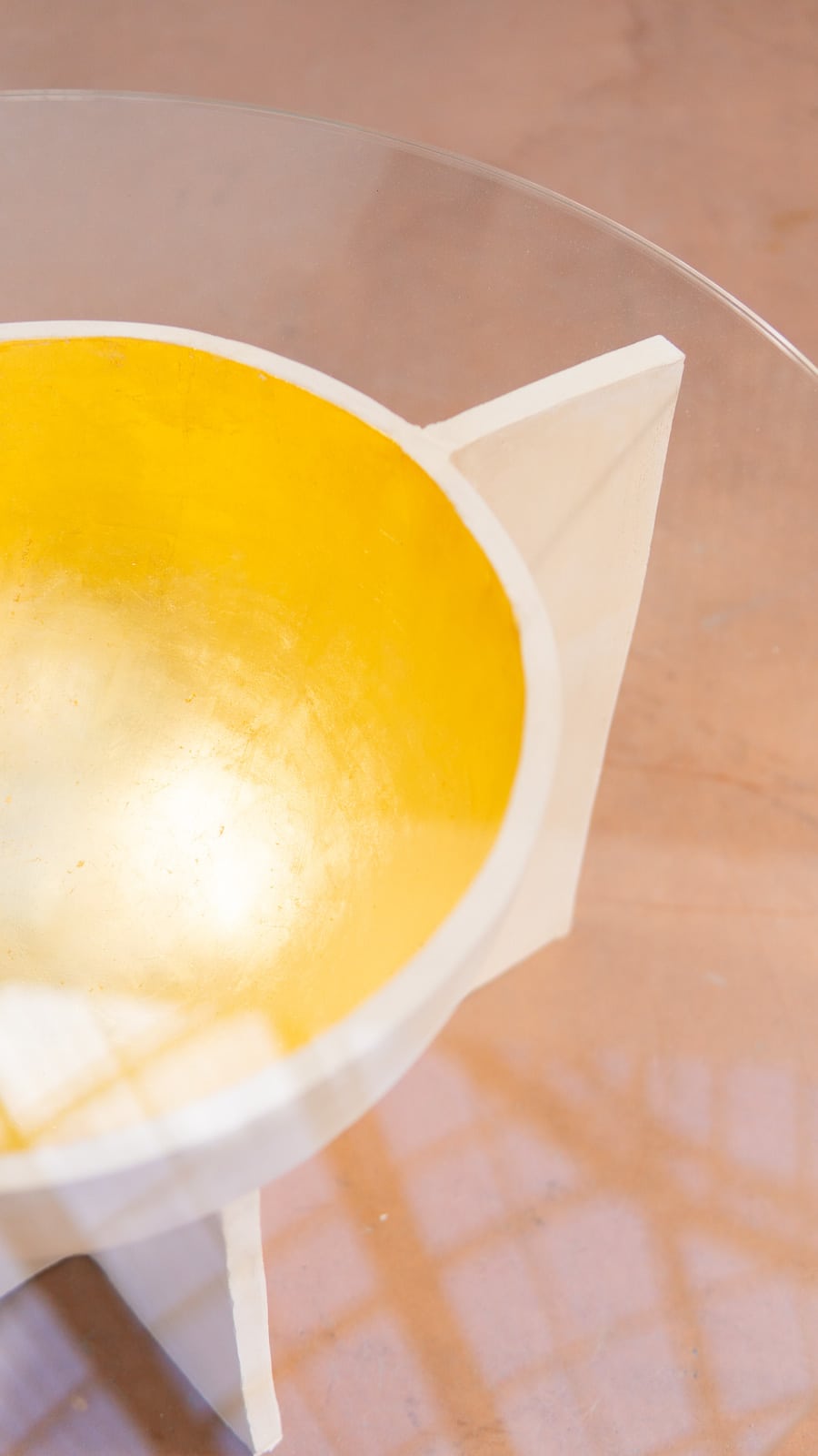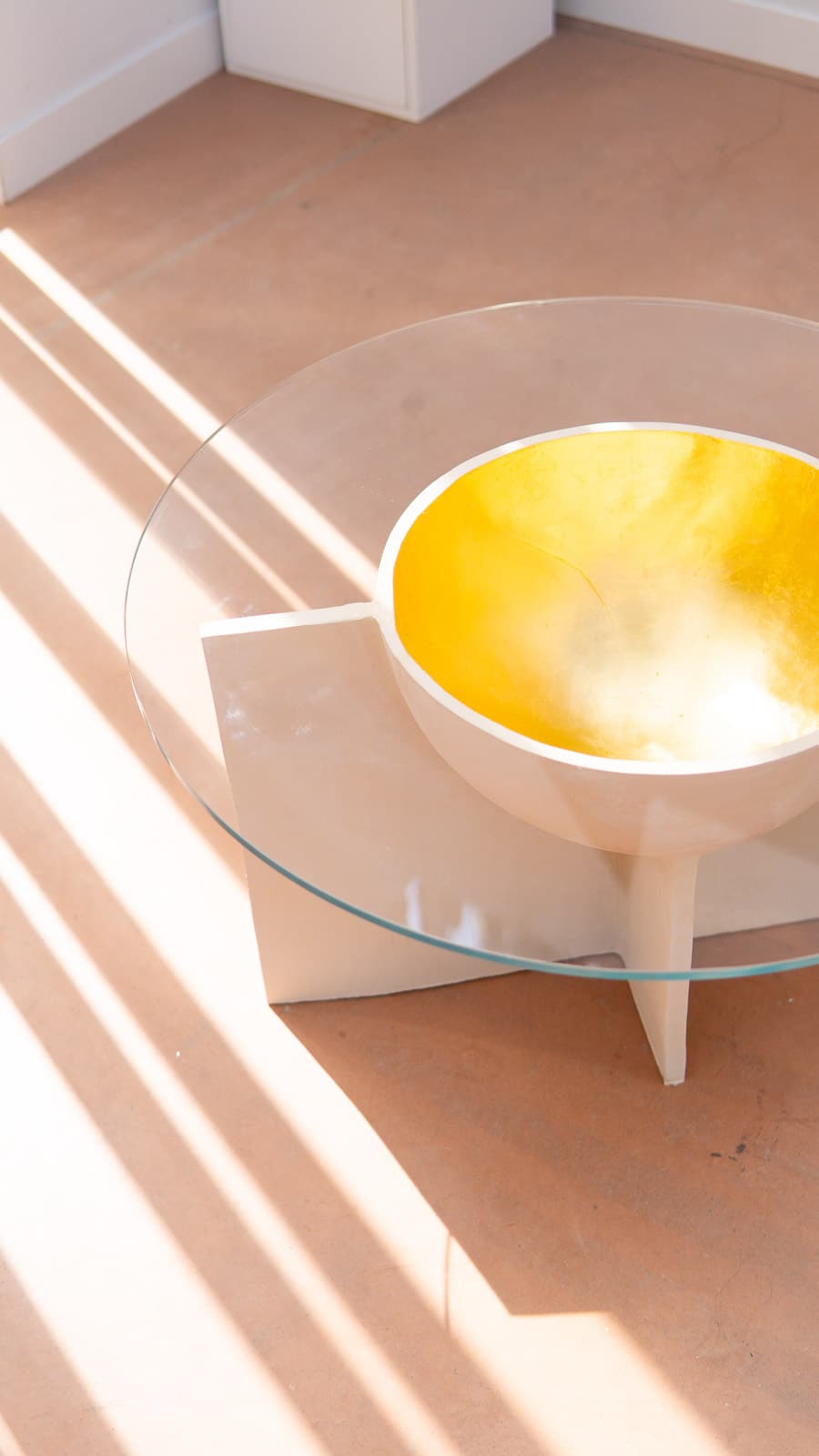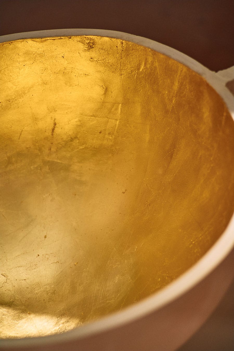 This sculptural coffee table features a bisqued white grogged earthenware base whose architectural geometry is anchored by a generous bowl form at its centre. The interior is hand-gilded with 23-carat gold leaf, creating a radiant, reflective core that contrasts with the matte, mineral quality of the earthenware. Protected with a specialised invisible impregnation treatment, the ceramic retains its natural softness while ensuring durability.
