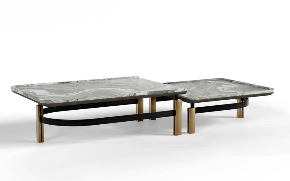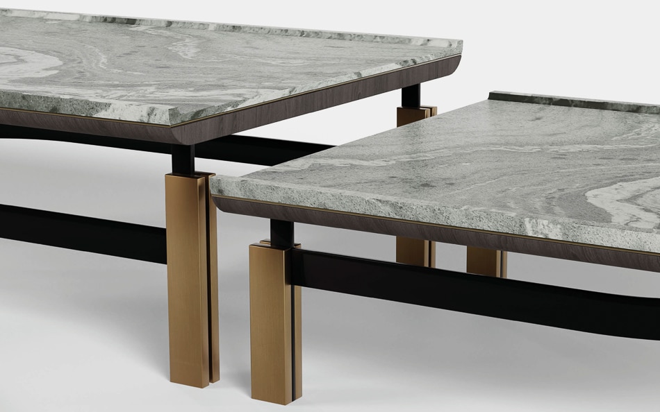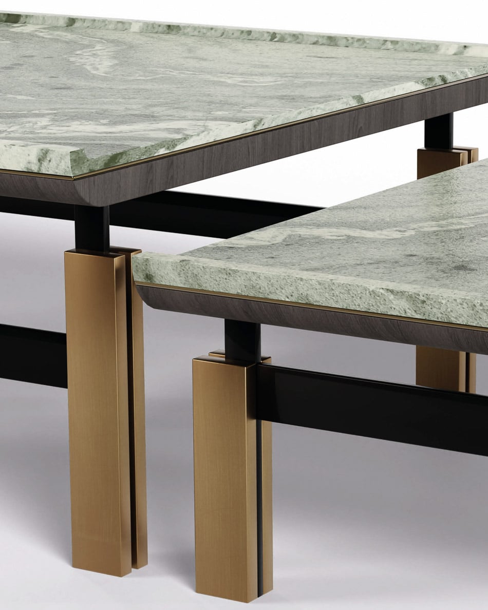 The Field Coffee Table II embodies Atelier Tortil’s sculptural elegance and refined material sensibility. Its tabletop brings together the cool depth of honed Green Jade marble and the natural warmth of figured sycamore veneer, creating a balanced composition of tone and texture. The tabletop base is crafted from certified wood composite, veneered and finished in matte, satin, or glossy varnish, framed by a patinated brass inlay that enhances its sculptural outline.