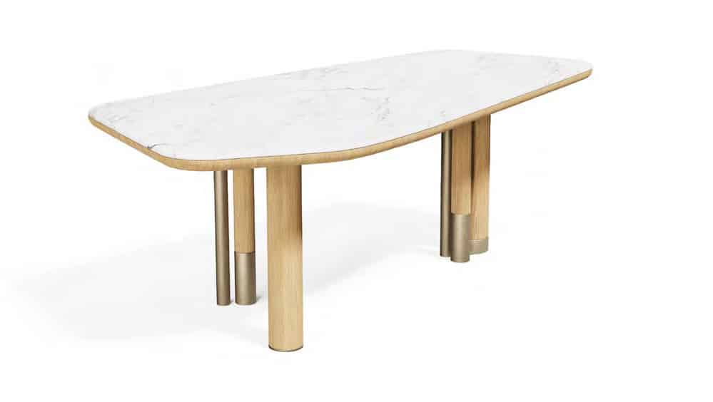 The Lagoa Dining Table II embodies Atelier Tortil’s sculptural elegance and refined material sensibility. Its softly contoured tabletop in white Estremoz marble rests on cylindrical legs crafted from solid and veneered natural oak with patinated brass detailing. The combination of smooth stone and warm timber reveals a dialogue of texture and tone, showcasing the craftsmanship that defines every Atelier Tortil piece.