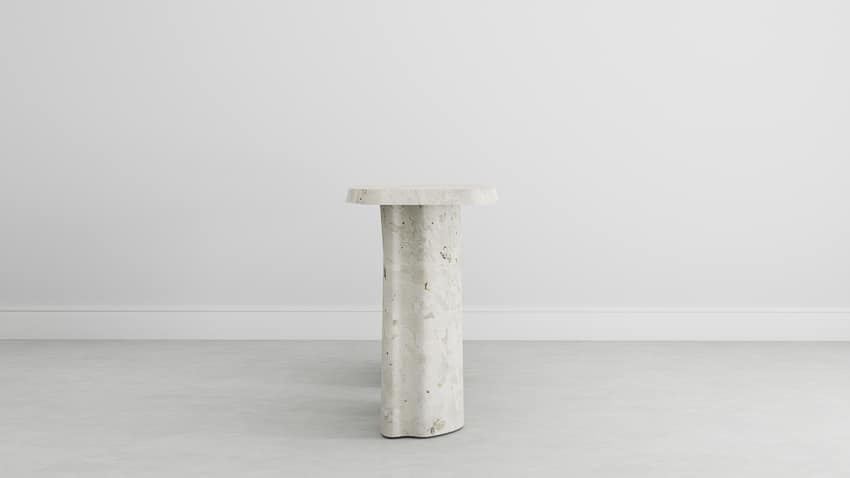 The Sirmione Console is crafted in Breccia Aurora, a classic Italian marble distinguished by its soft ivory base, subtle warm undertones and delicate, naturally fragmented veining. Each slab is hand-selected and sourced exclusively by Melchiorri, ensuring every table carries a unique composition that cannot be replicated. Finished in the intermediate honed texture, the surface enhances the marble’s quiet luminosity while revealing depth, refinement and material richness.
