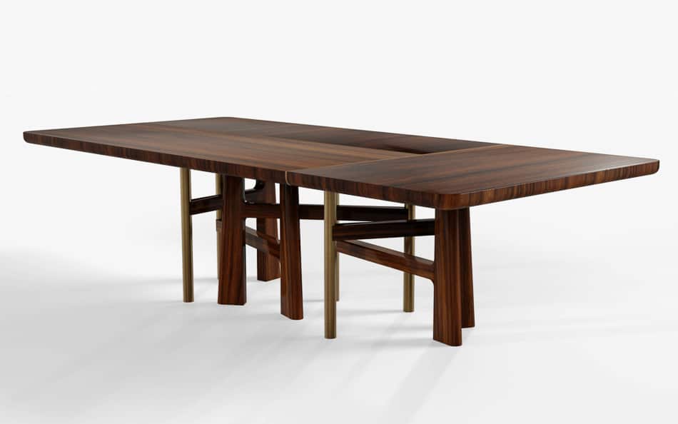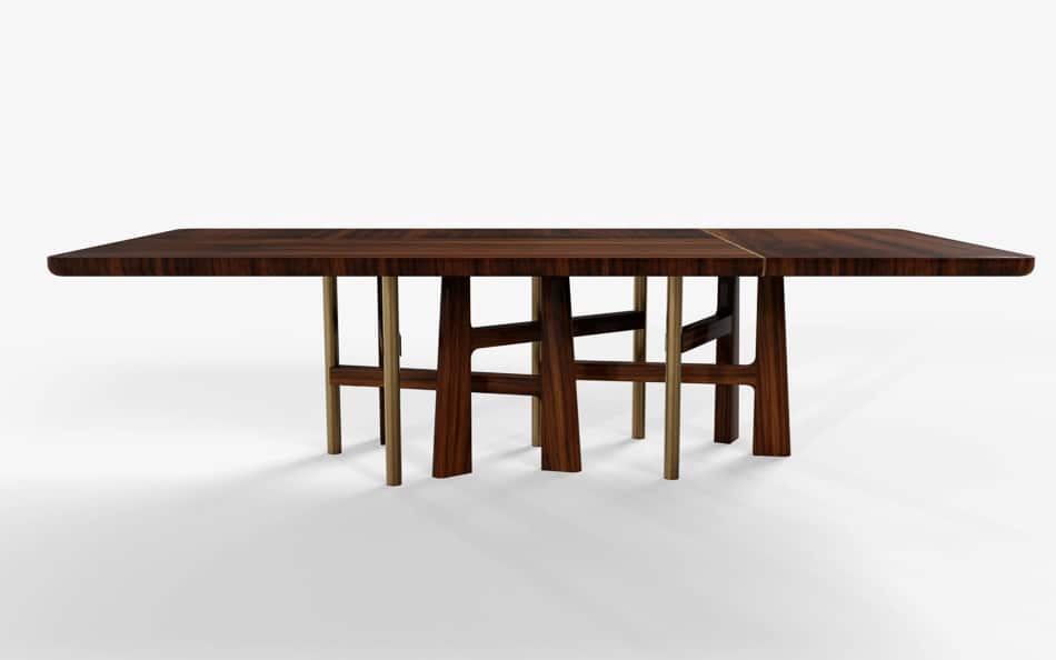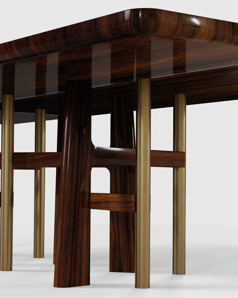 The legs, made of solid ash and veneered in wood, are finished in matte, satin, or glossy varnish with patinated brass tubing that enhances the table’s architectural balance. The interplay of Macassar and brass celebrates craftsmanship, texture, and tone in a timeless design suited to both contemporary and classic interiors.
