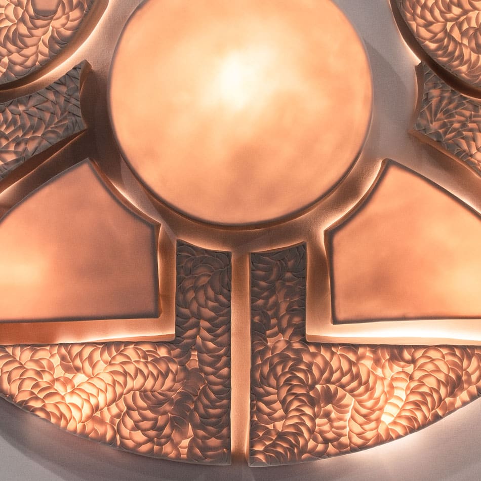 Each element is hand-crafted with intricate reliefs and subtle variations in thickness that come alive when illuminated, casting layered shadows and warm, diffused light across the surface. When unlit, the matte porcelain reveals its sculptural detail; when lit, the piece transforms into a radiant tableau of texture, depth, and soft luminosity.