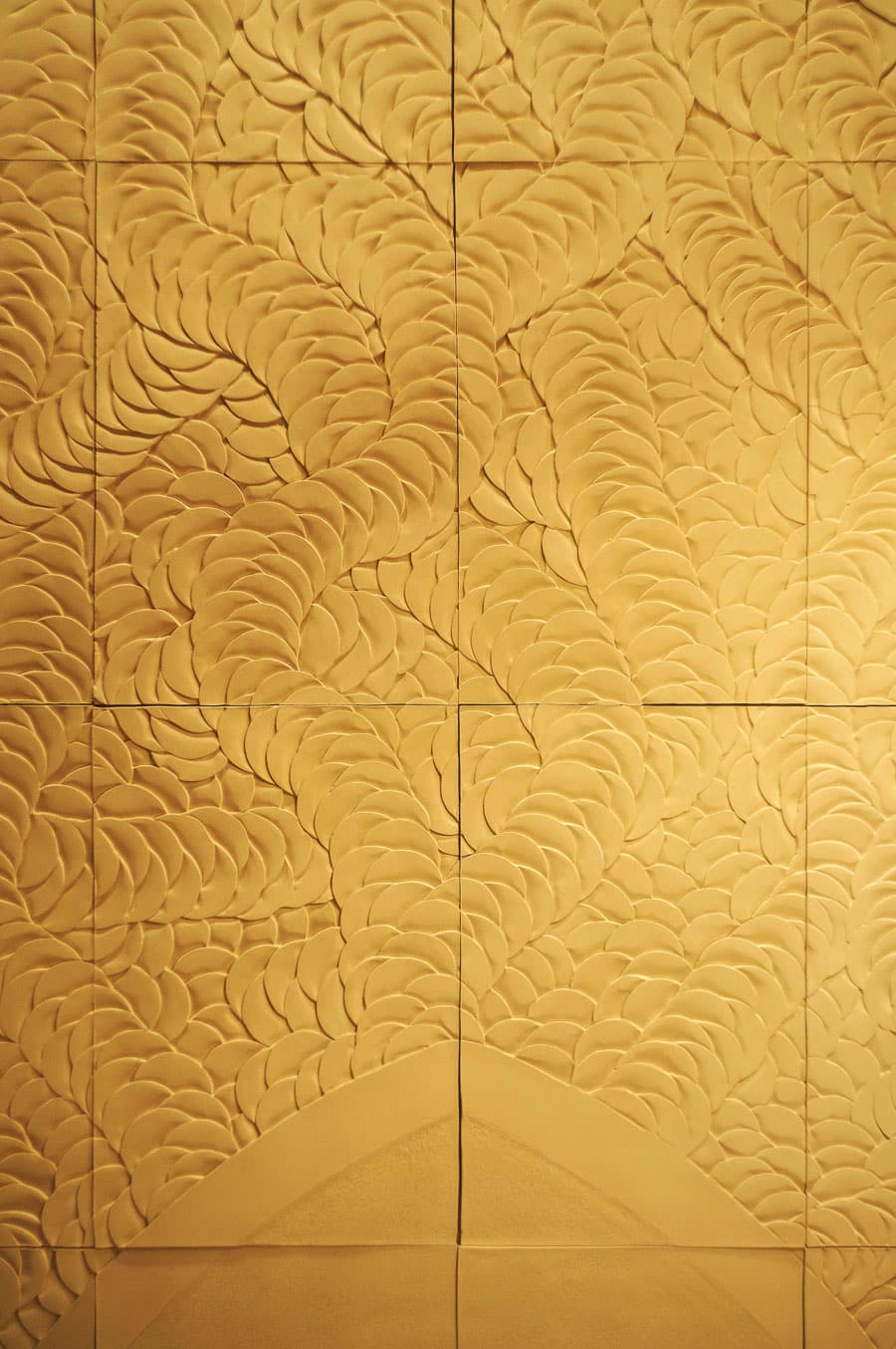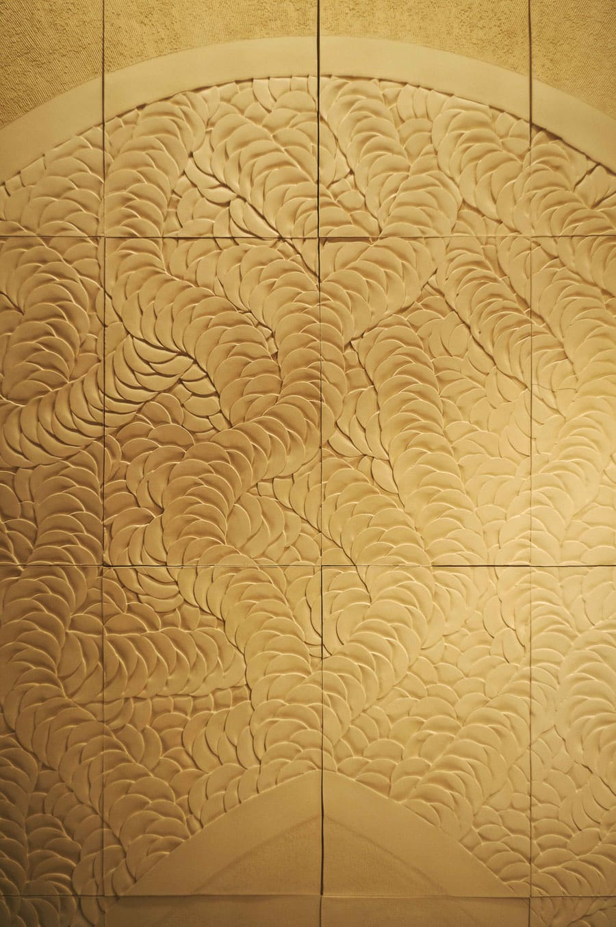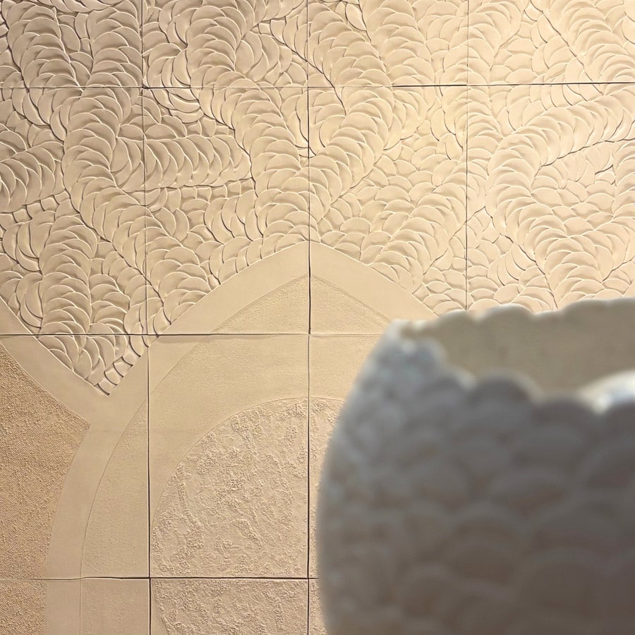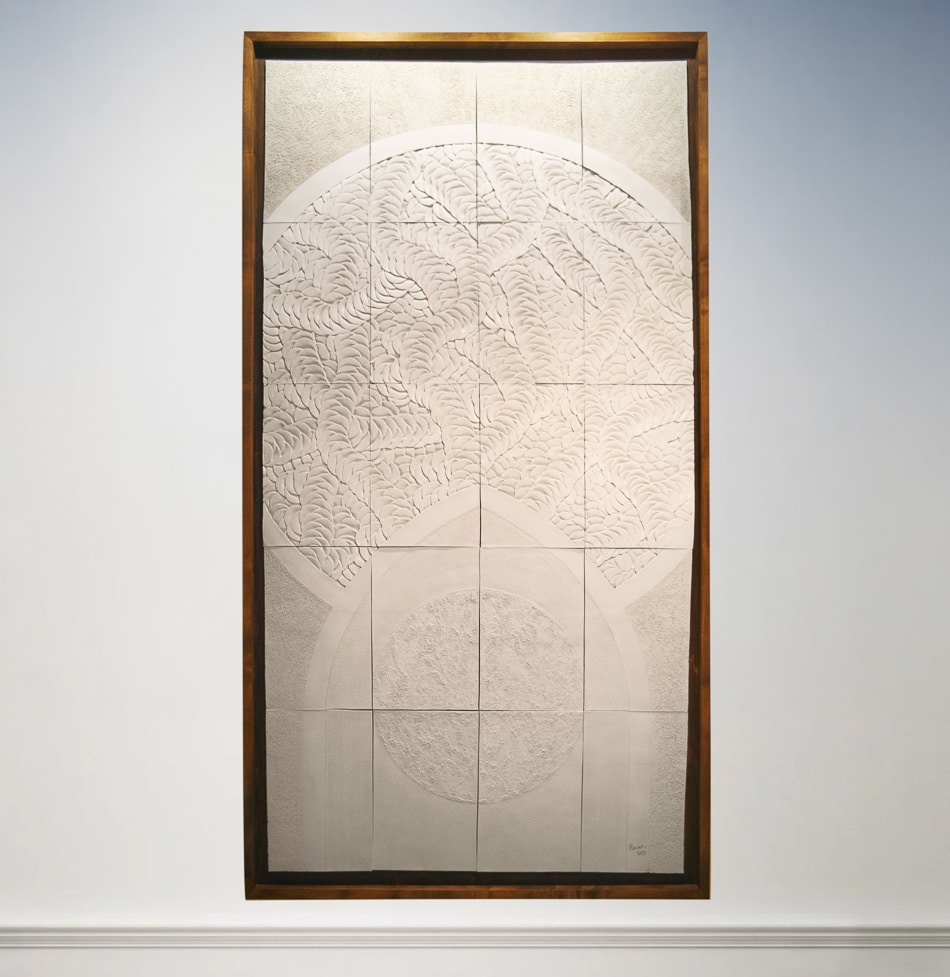 This sculptural wall piece brings together smooth and grogged bisqued white earthenware tiles, each carefully carved with the artist’s signature relief motifs. The composition blends soft textural contrasts with sweeping, architectural curves, creating a sense of movement across the tiled surface. Select areas are gilded with 23-carat gold leaf, adding warmth and luminosity, while a protective invisible impregnation preserves the finish. Framed in maple, the work stands as both an artwork and a refined architectural element, merging craftsmanship and sculpture at scale.