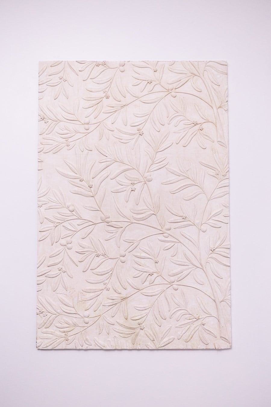 A soft, rhythmic composition of olive branches unfolds across this plaster bas-relief, where slender leaves and delicate fruit are rendered with understated precision. The motif carries a quiet Mediterranean sensibility, evoking warmth, light, and a sense of timeless continuity.