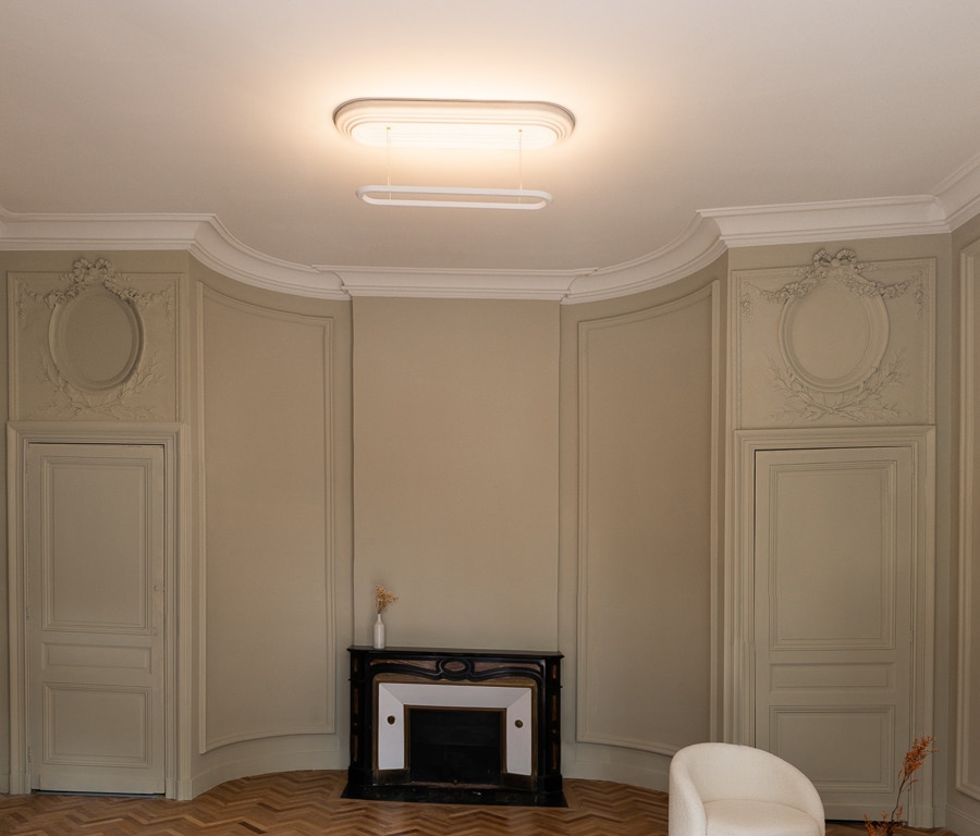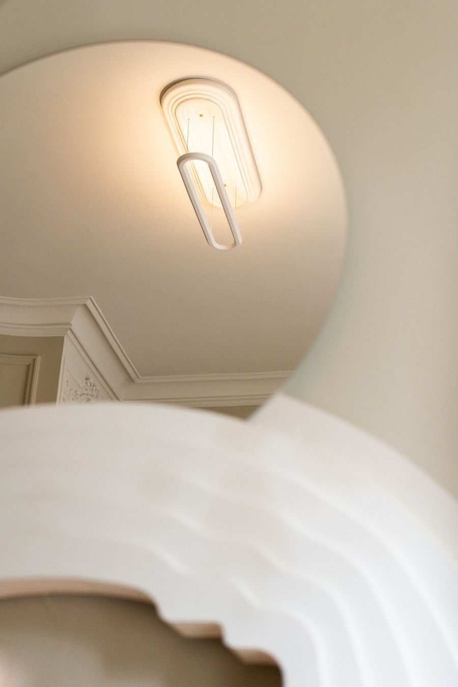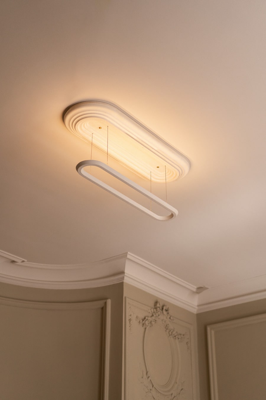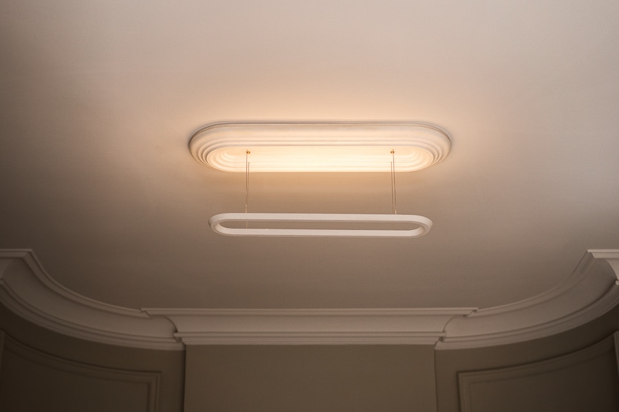 The Zenith Suspension Light expresses a refined dialogue between ornament and function, reinterpreting a familiar architectural motif with a contemporary sensibility. By inverting traditional hierarchies, the design elevates the rosette as the central feature, transforming it into a defining element of the composition.