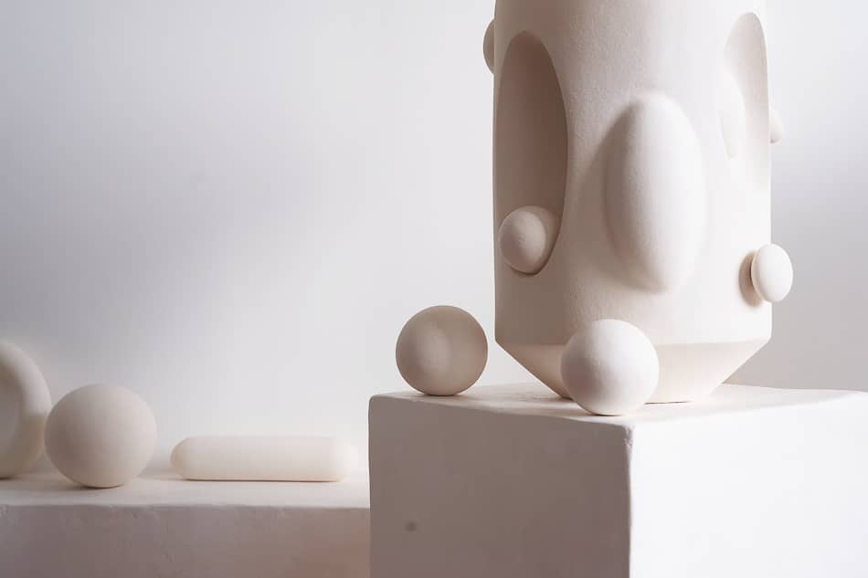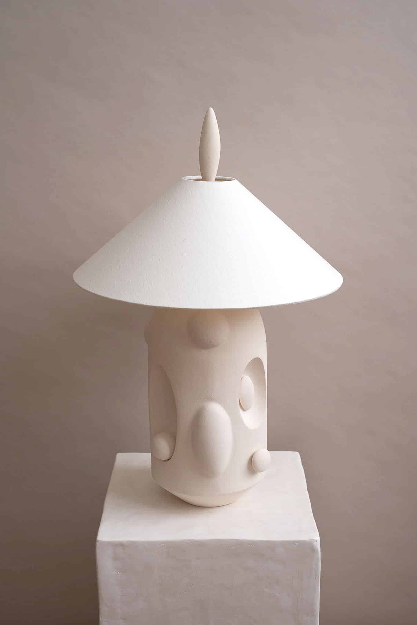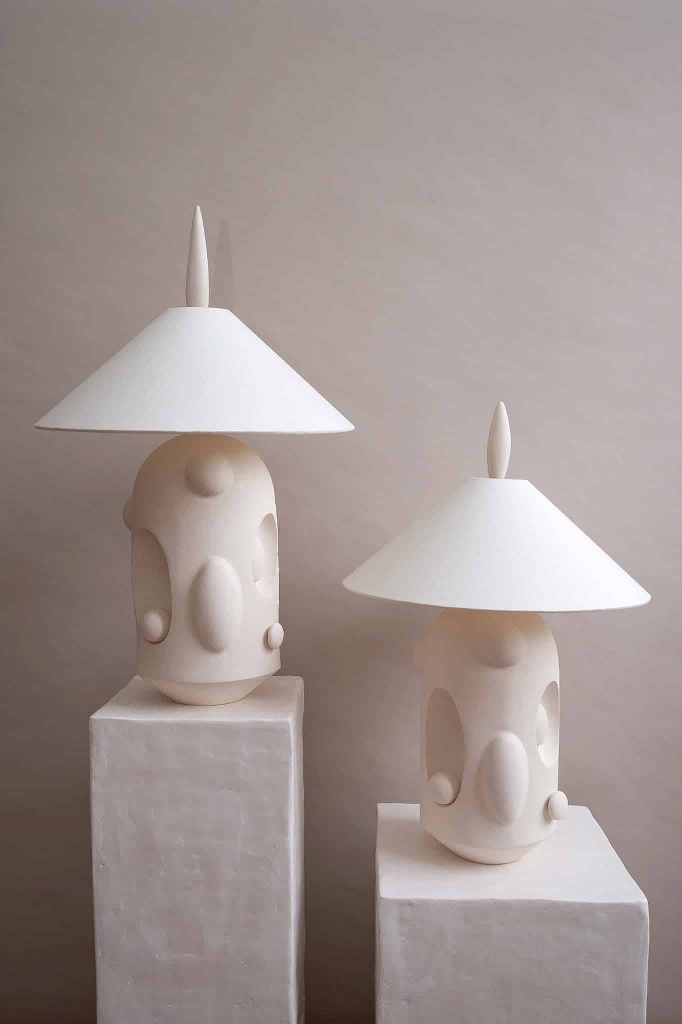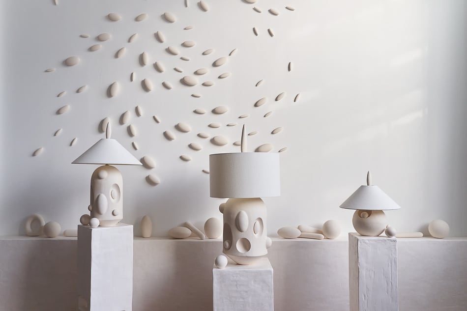 “The Sculptural lamps are the most intricate expression of this established language in clay. These works unfold as living architectures, forms that loop, lean, nest, and carve into themselves with quiet intentionality. Concaves and protrusions meet in fluid dialogue, creating shifting pockets of shadow and light. Each piece is a unified body composed of many gestures, elements weaving in and out, echoing one another, completing the composition without ever feeling symmetrical or expected. They are autonomous, tactile environments rather than objects, sculptural terrains that invite slow looking, revealing new relationships between form and light from every angle.”