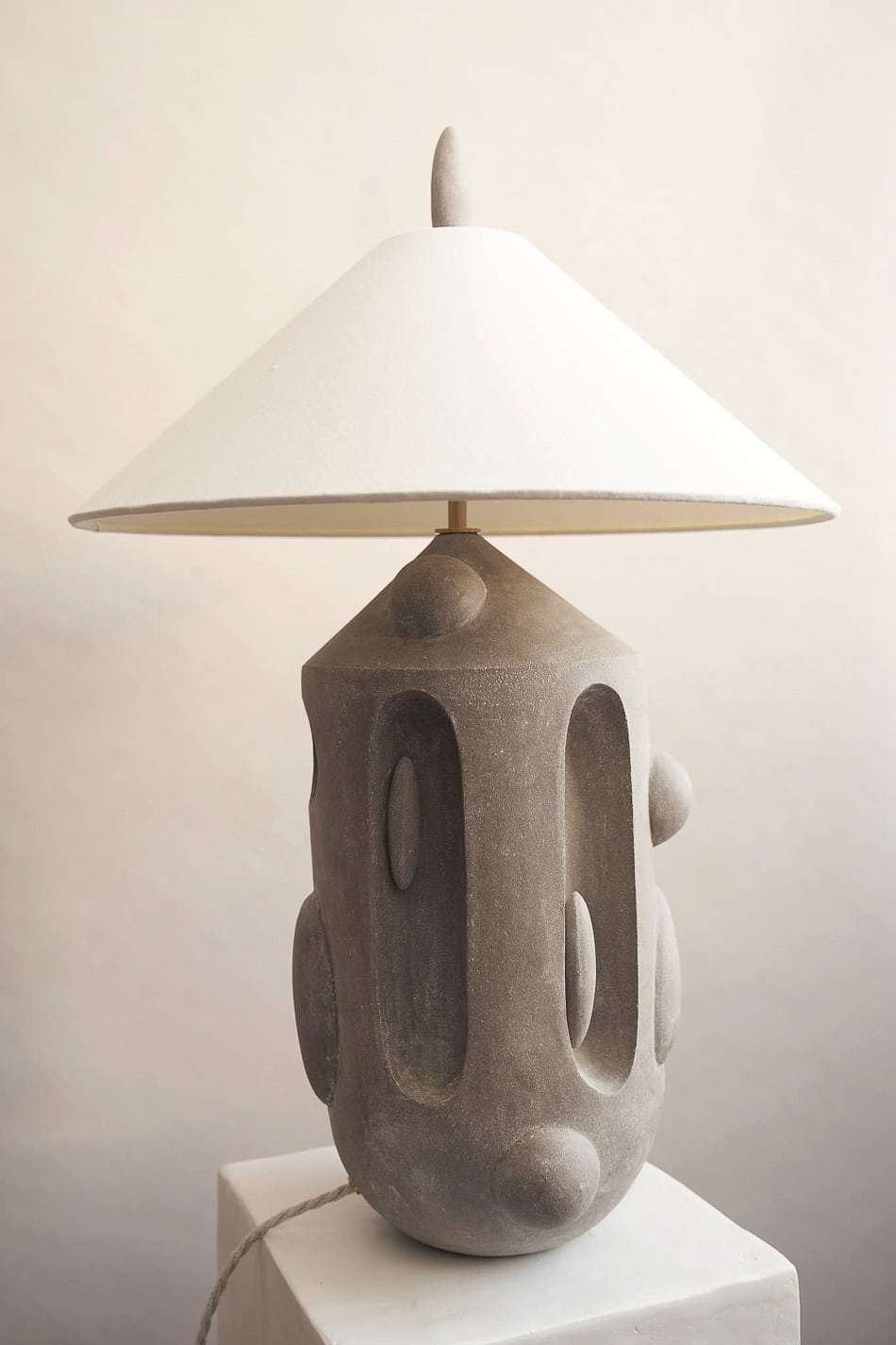 Soft concaves and elongated recesses shape the form into a tall, sculptural body with a quiet architectural presence. Rounded protrusions punctuate the surface, creating a rhythmic interplay of volume and shadow across the smooth grey stoneware. Light rests gently within these carved contours, revealing the depth and tactility of the clay. A concealed stoneware dimmer is integrated seamlessly into the sculpture, preserving the purity of the form. The bespoke linen shade and customisable handmade finial complete the piece with refined softness.