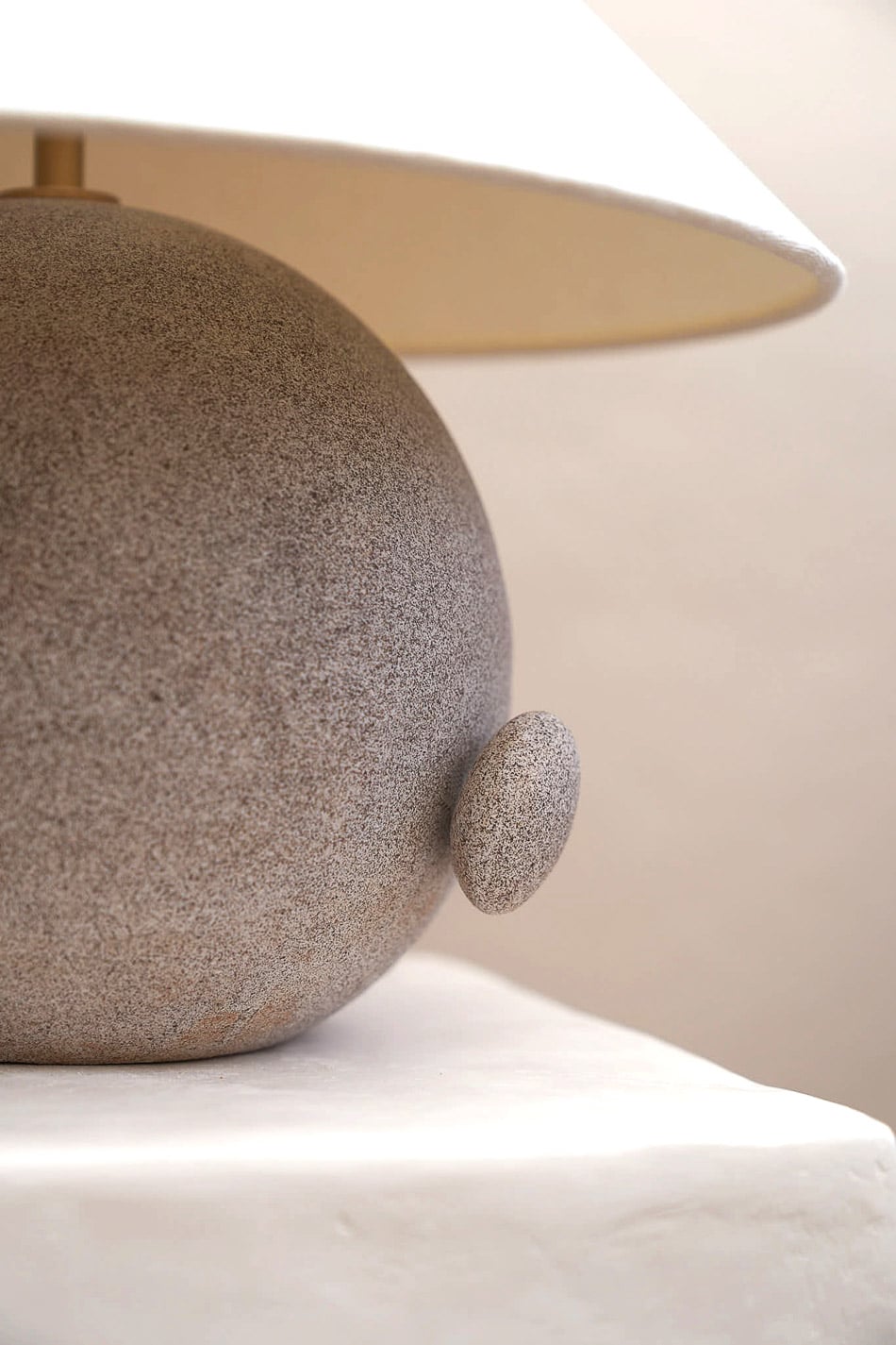 Shaped from speckled white stoneware, the rounded form carries a soft, tactile presence, its surface gently shifting in tone and texture. Light settles across the matte speckling, revealing the natural movement of the clay and the quiet refinement of its making. A concealed stoneware dimmer is integrated seamlessly into the body, functioning as part of the sculpture and preserving the purity of the silhouette. The complementary linen shade and customisable handmade finial complete the piece with understated softness.