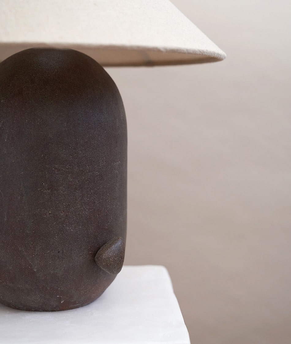 Shaped from green bronze stoneware, the elongated form carries a deep, mineral richness, its surface shifting subtly between earthy brown and muted green tones. The rounded contours and grounded silhouette give the piece a calm, sculptural presence, while light glides softly across the matte finish, revealing the natural variation embedded in the clay. A concealed stoneware dimmer is integrated seamlessly into the body, functioning as part of the sculpture and preserving the purity of the silhouette. The complementary linen shade and customisable handmade finial complete the piece with quiet refinement.