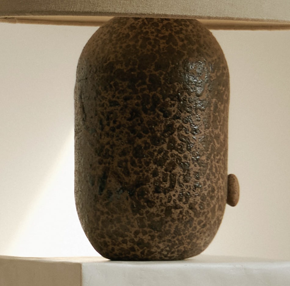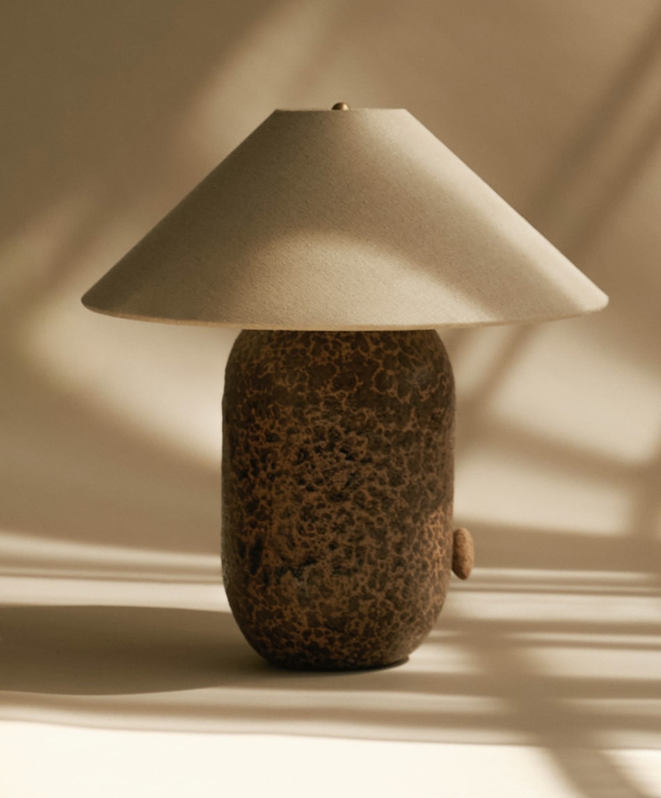 Formed from richly textured brown reincarnation stoneware, this piece has a grounded, monolithic presence. Rounded contours and a softly tapered top allow light to settle warmly across the surface, deepening its natural speckled character. A concealed stoneware dimmer is built into the form, maintaining the sculptural purity of the silhouette.