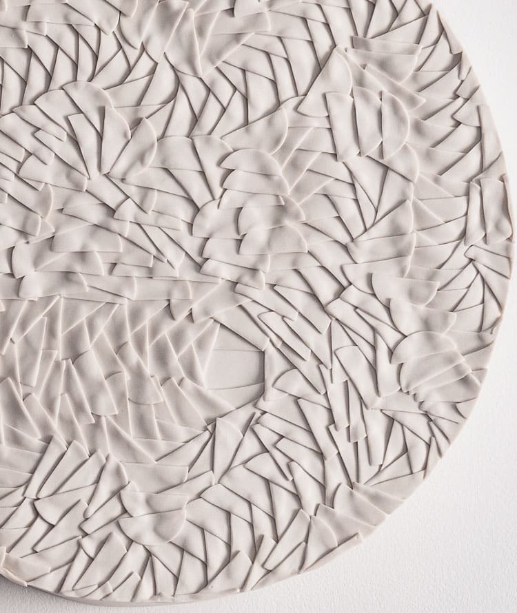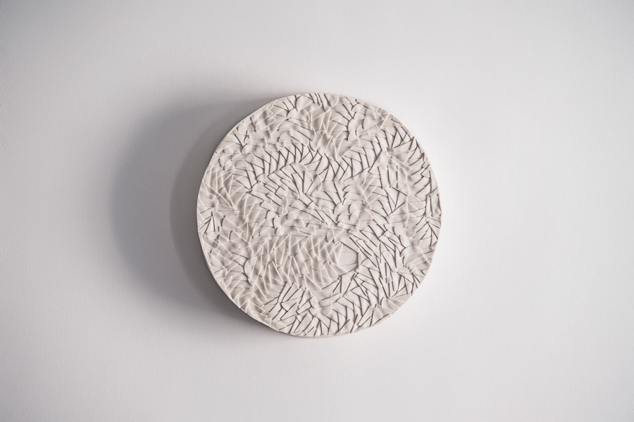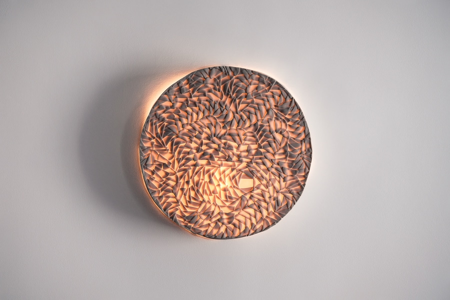 This mural light sculpture in porcelain biscuit features a dynamic, hand-built composition of finely cut and delicately layered fragments, creating an intricate, rhythmic surface. The pattern forms a swirling, almost windswept relief that invites the eye to trace its movement. When illuminated, the thin porcelain reveals a warm, diffused glow that accentuates the depth and direction of each element, casting lively, expressive shadows across the wall. When unlit, its matte white presence remains sculptural and refined, showcasing the precision and complexity of its craftsmanship.
