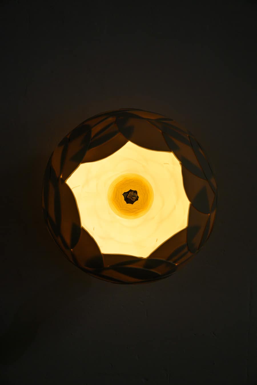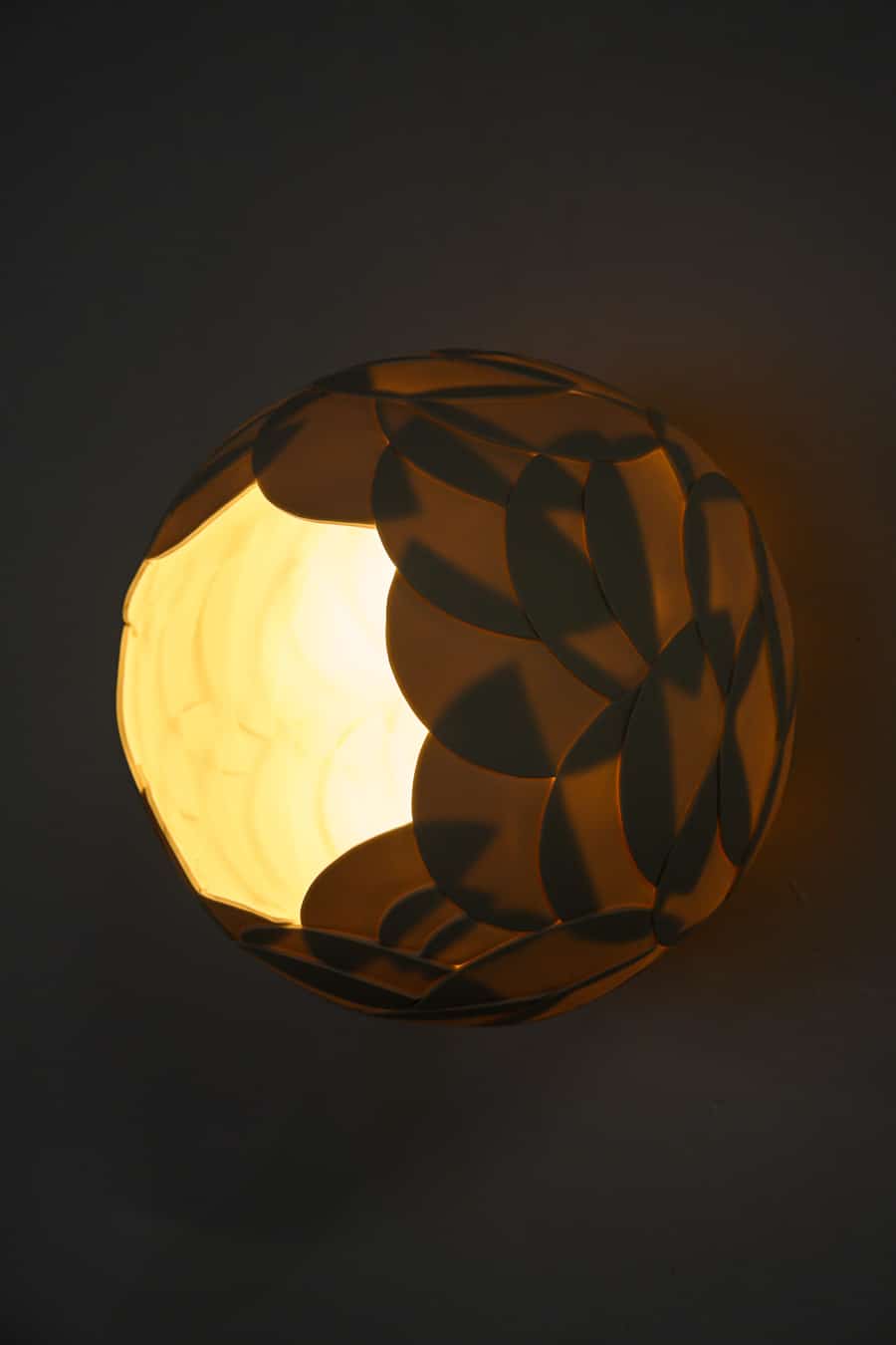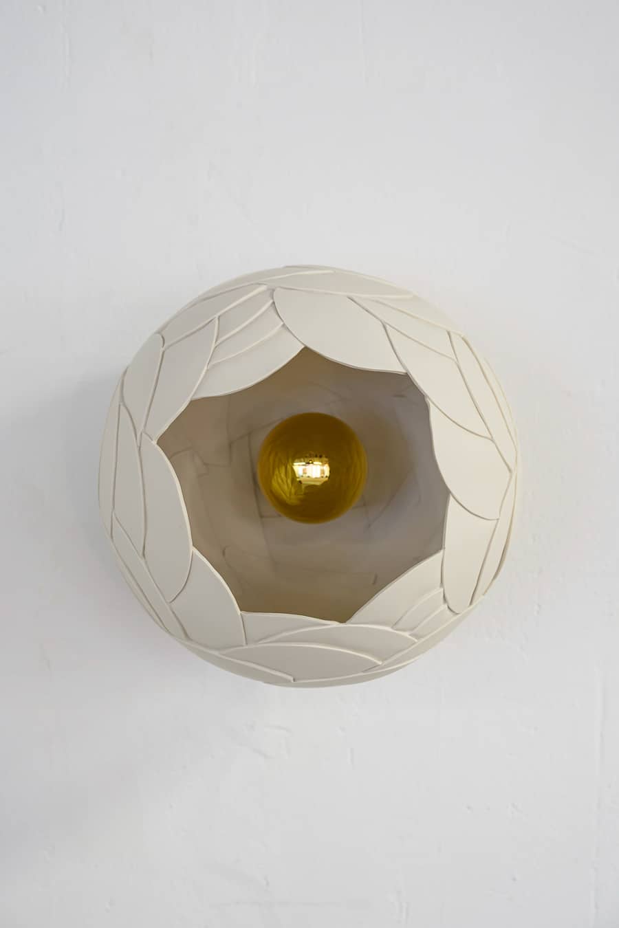 This porcelain biscuit wall light is shaped from generously curved, hand-applied elements that create a soft, layered relief across its rounded form. When illuminated, the thin porcelain reveals a warm, radiant glow, casting expressive, shifting shadows that animate the surrounding space. When unlit, its matte surface remains quietly sculptural, accentuating the purity and precision of its handmade texture. Mounted on the wall, it becomes both a luminous artwork and a functional light. An elegant interplay of depth, shadow, and refined craftsmanship.