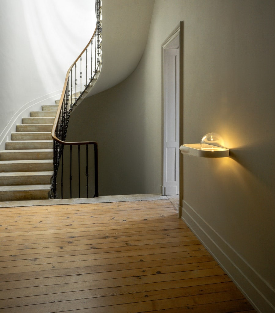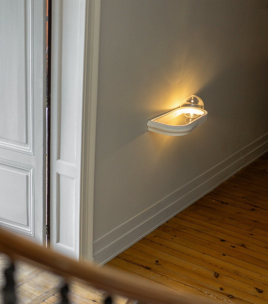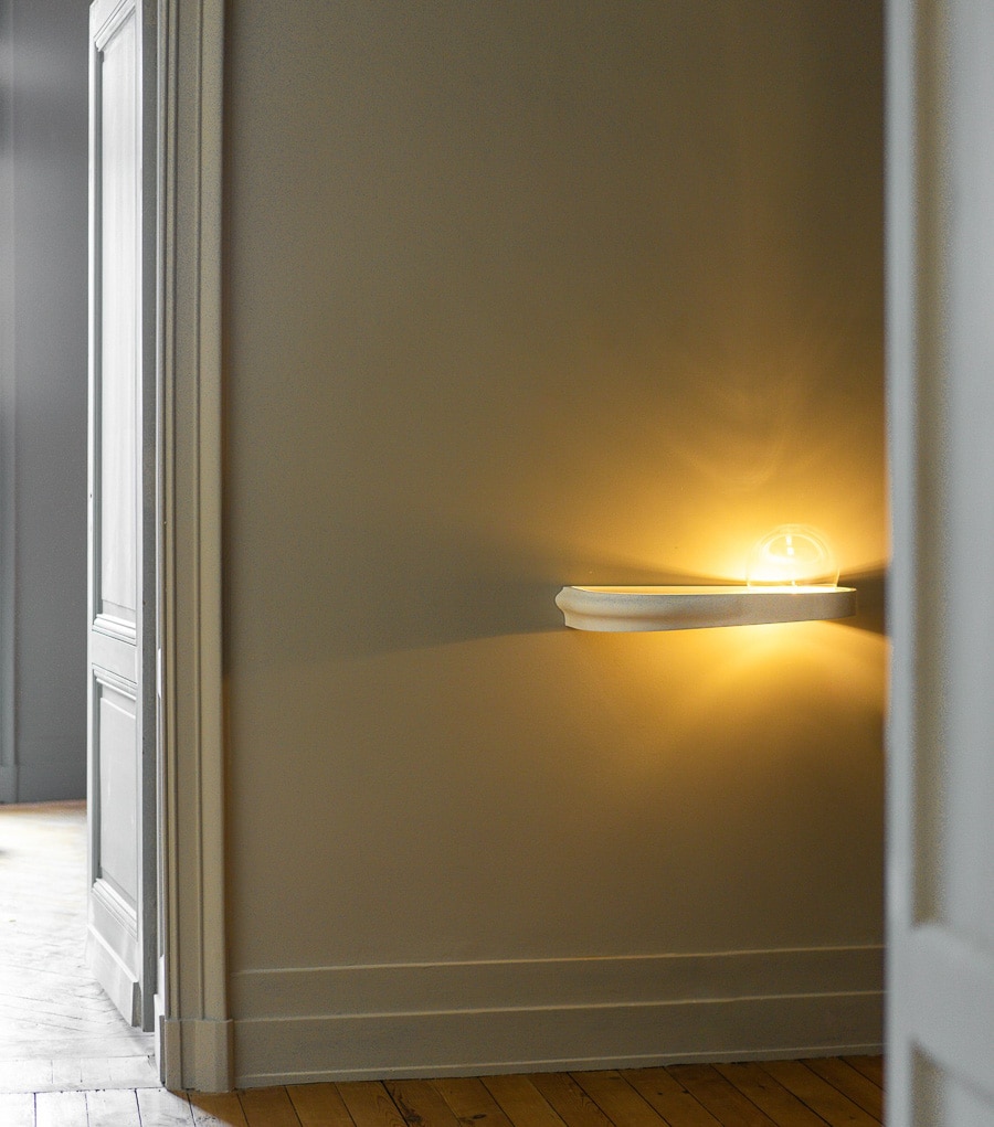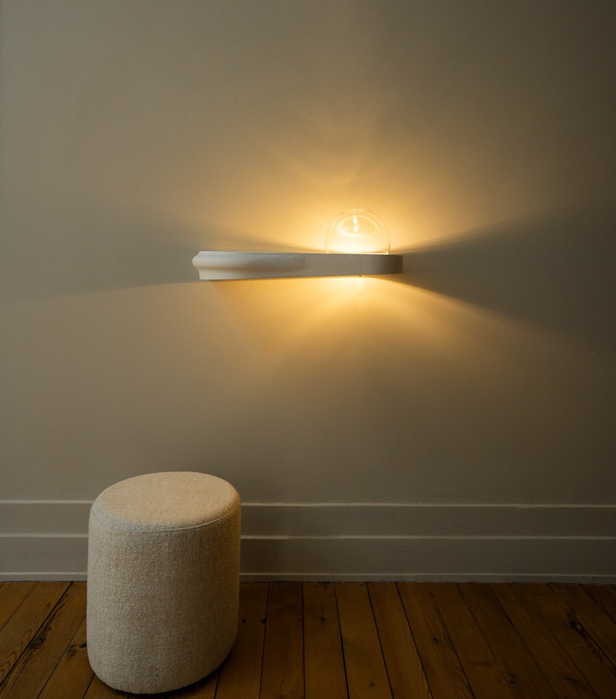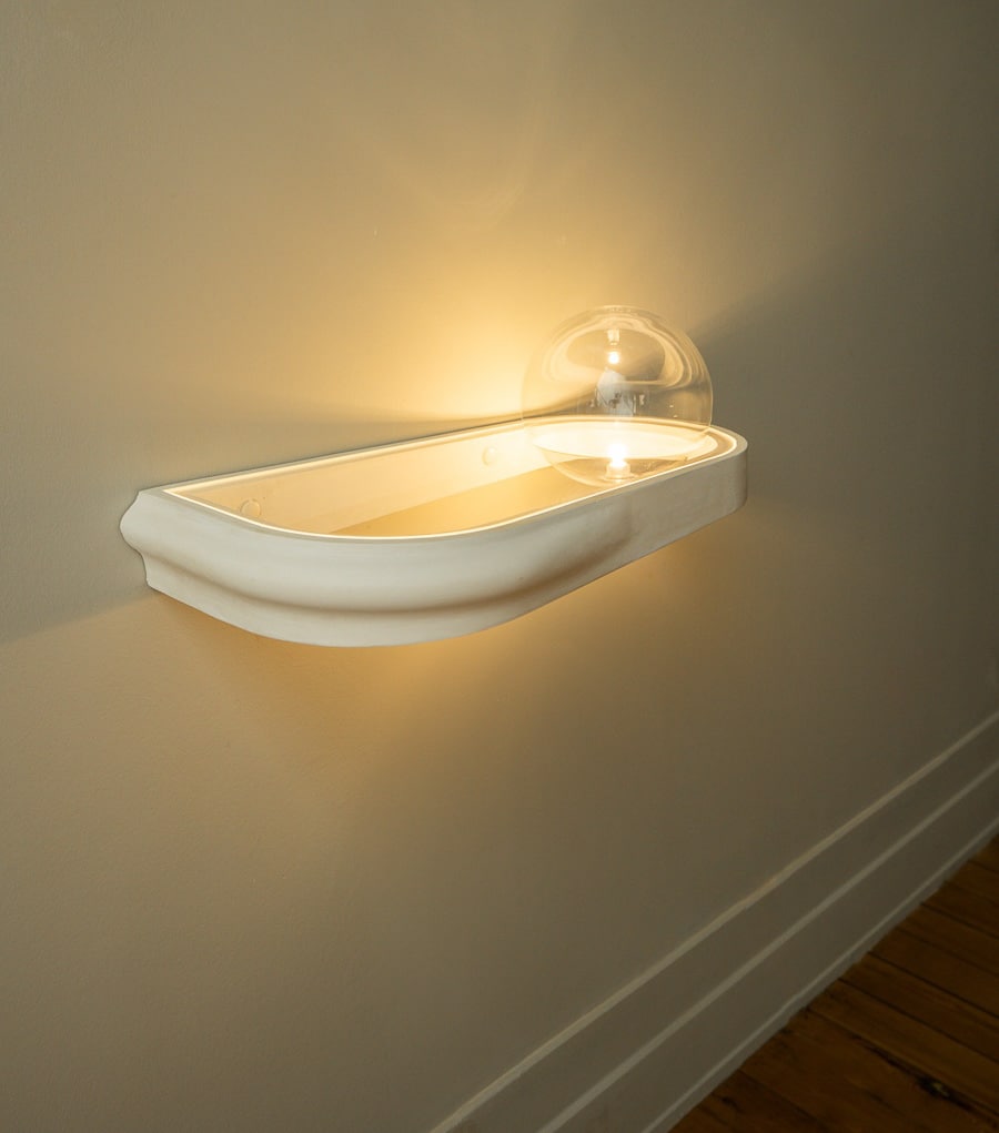 A contemporary trompe-l’œil, the piece creates a dialogue between the brilliance of glass and the matte softness of plaster, resulting in a quietly striking presence within a space. Crafted in staff with a glass tray and sphere, it becomes both object and architectural gesture.