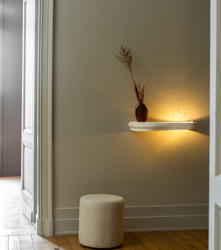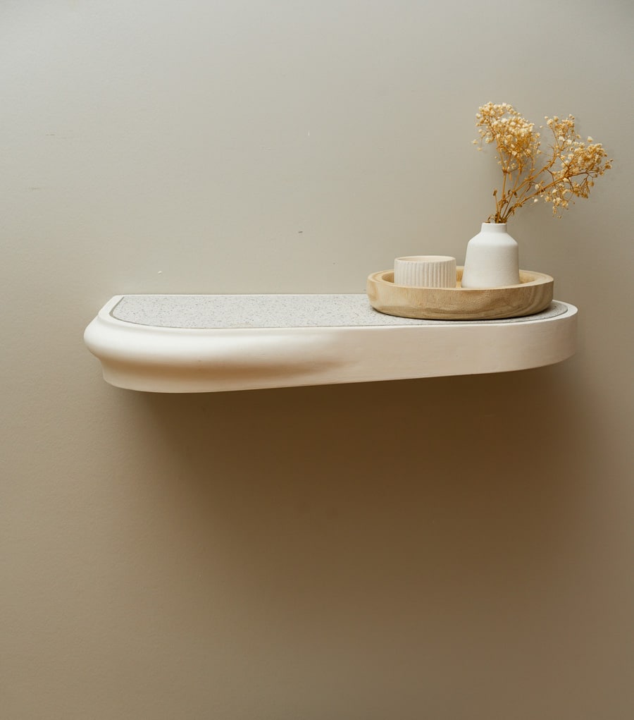 Balancing function and expression, the Eclectic Console explores the meeting point of utility and sculptural form. Its plaster edge, subtly articulated with reliefs inspired by traditional picture rails, is refined to achieve a sense of lightness and fluidity. Embracing asymmetry, the composition guides the eye toward its focal point, a luminous glass sphere poised in delicate equilibrium.