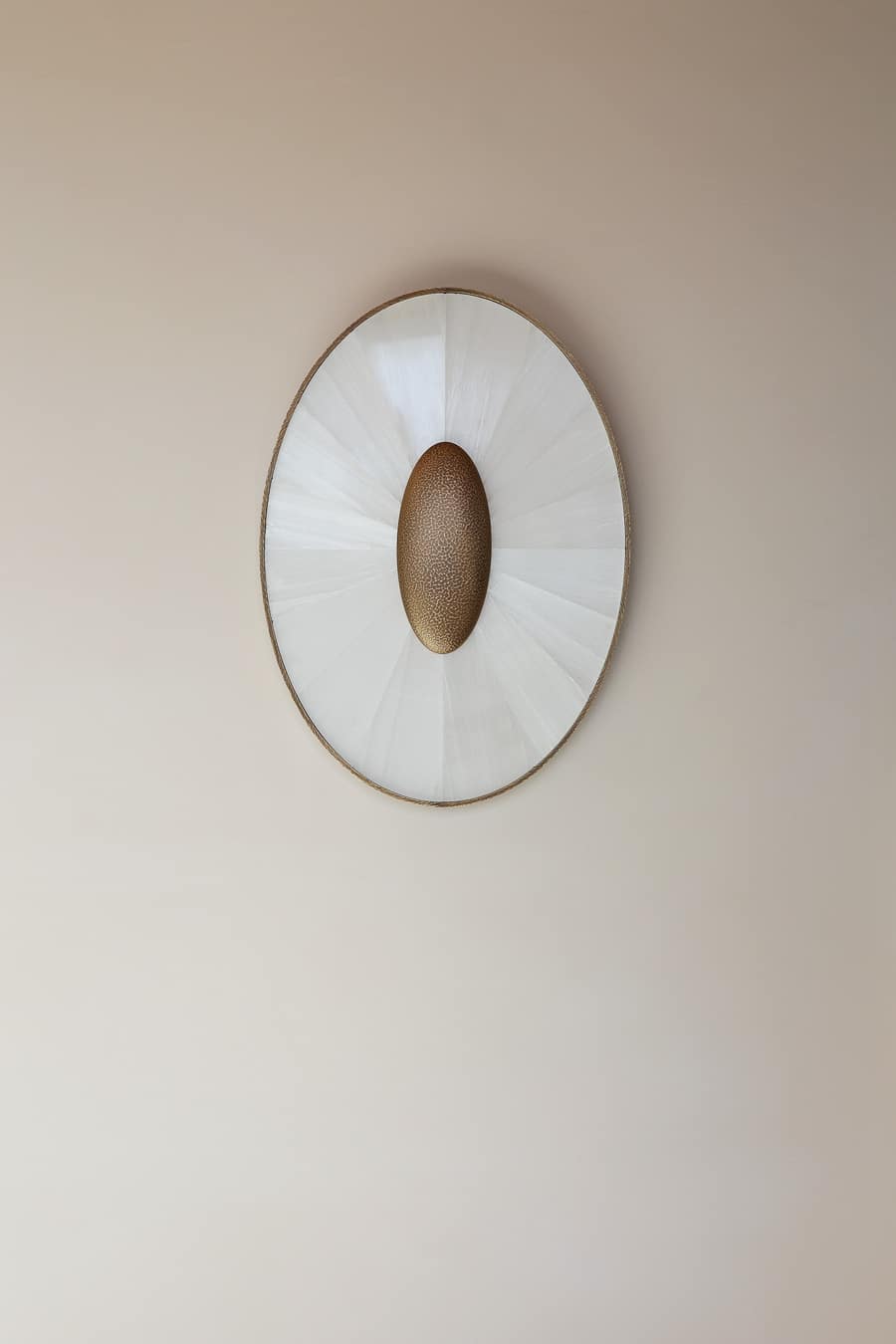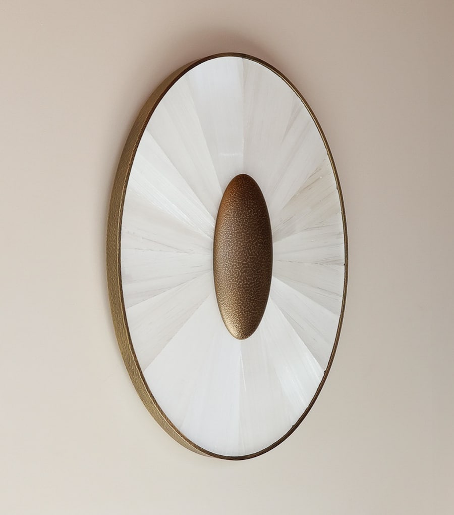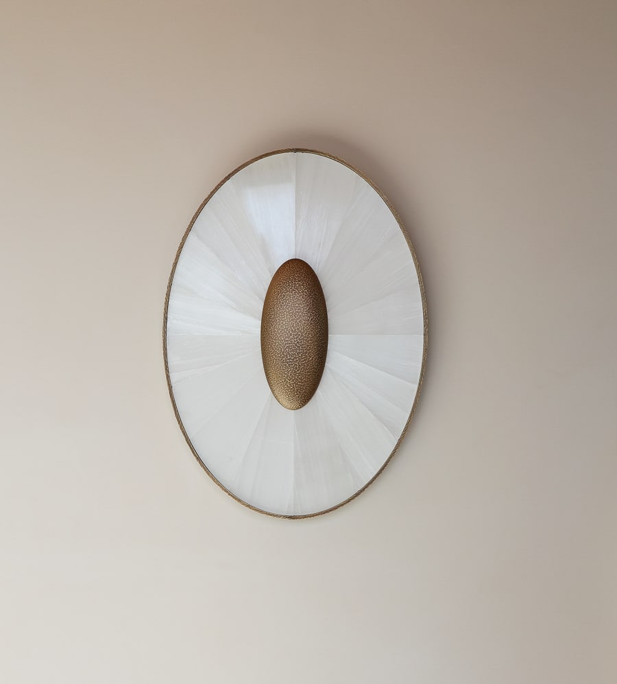 Finished in gypse with a central element in patinated brass, the piece brings warmth and depth, functioning as both lighting and wall sculpture.