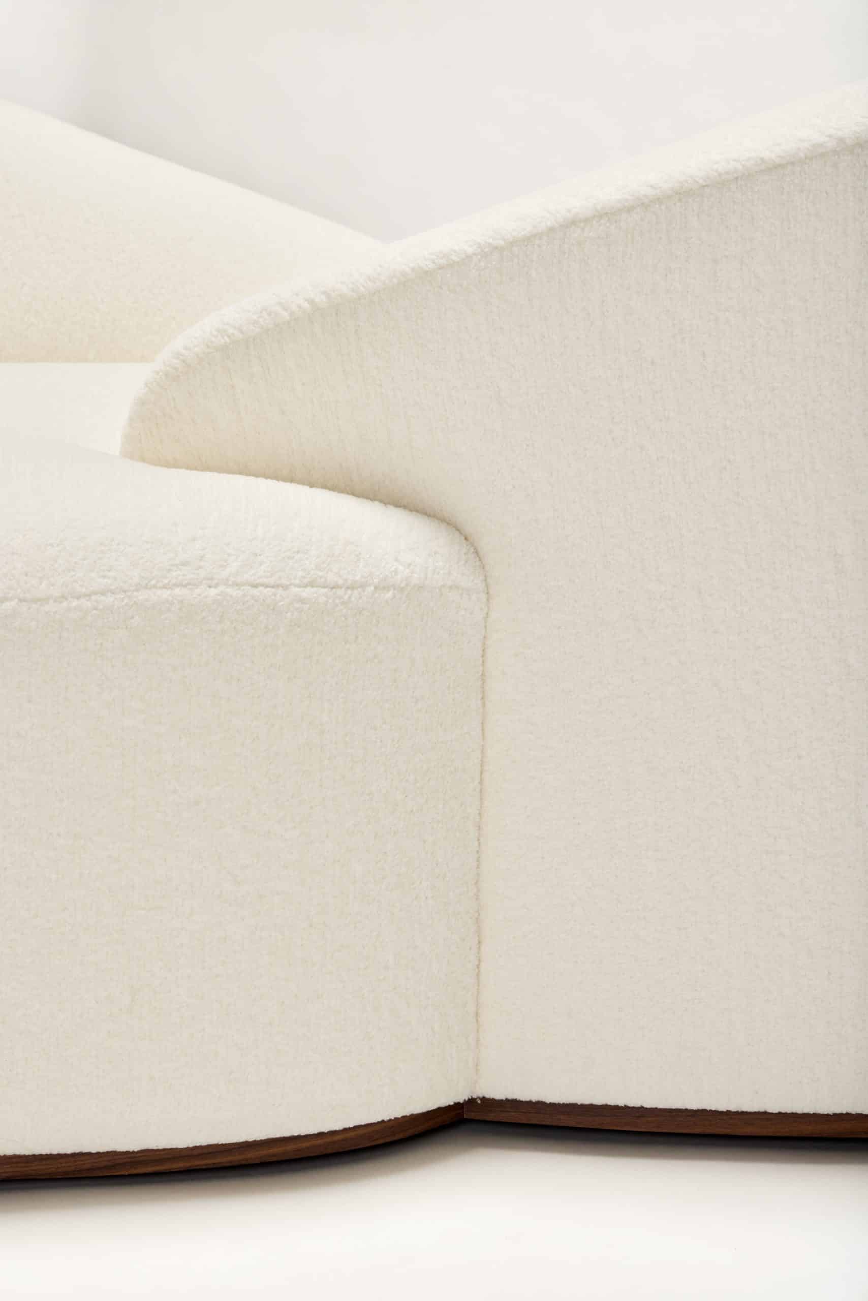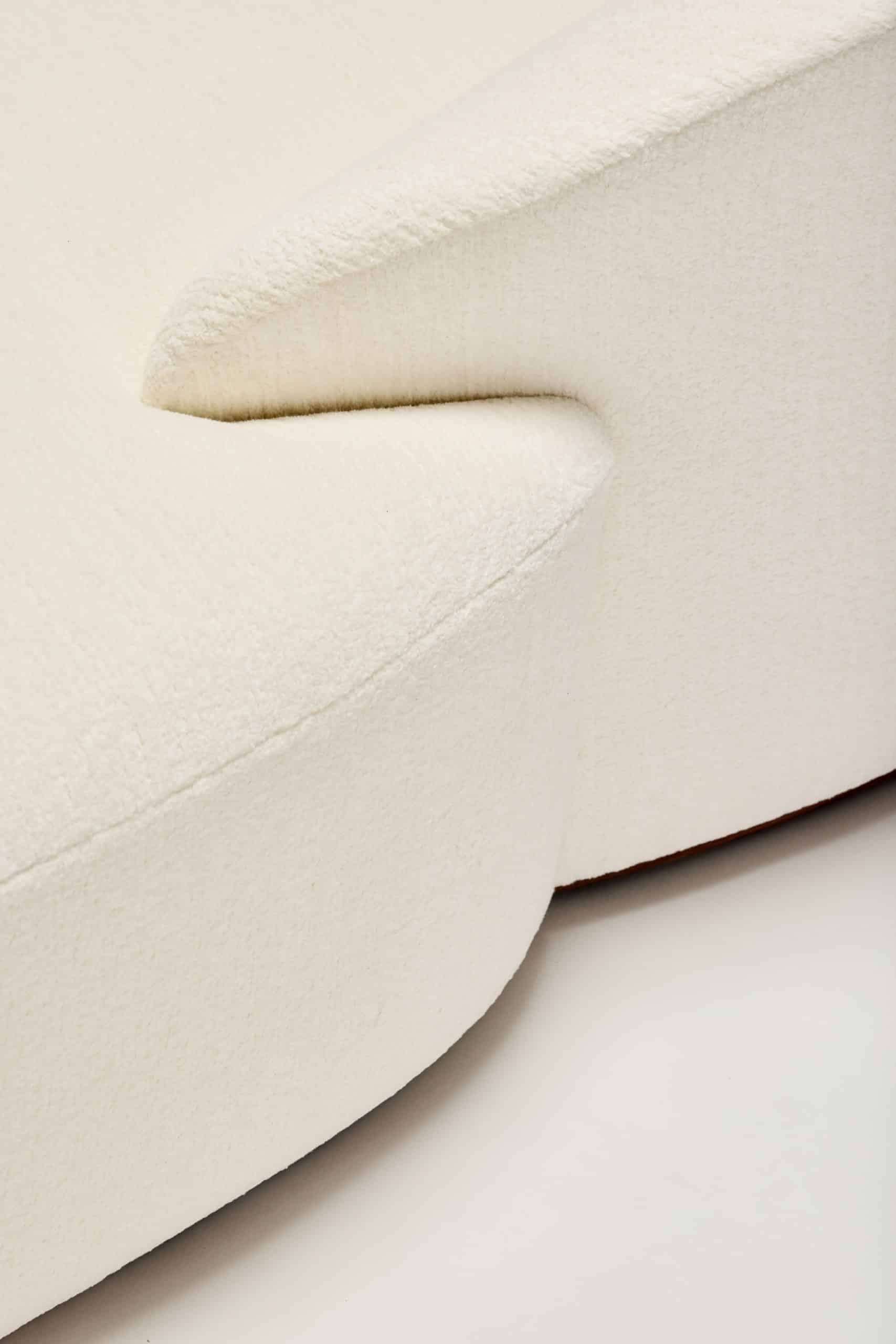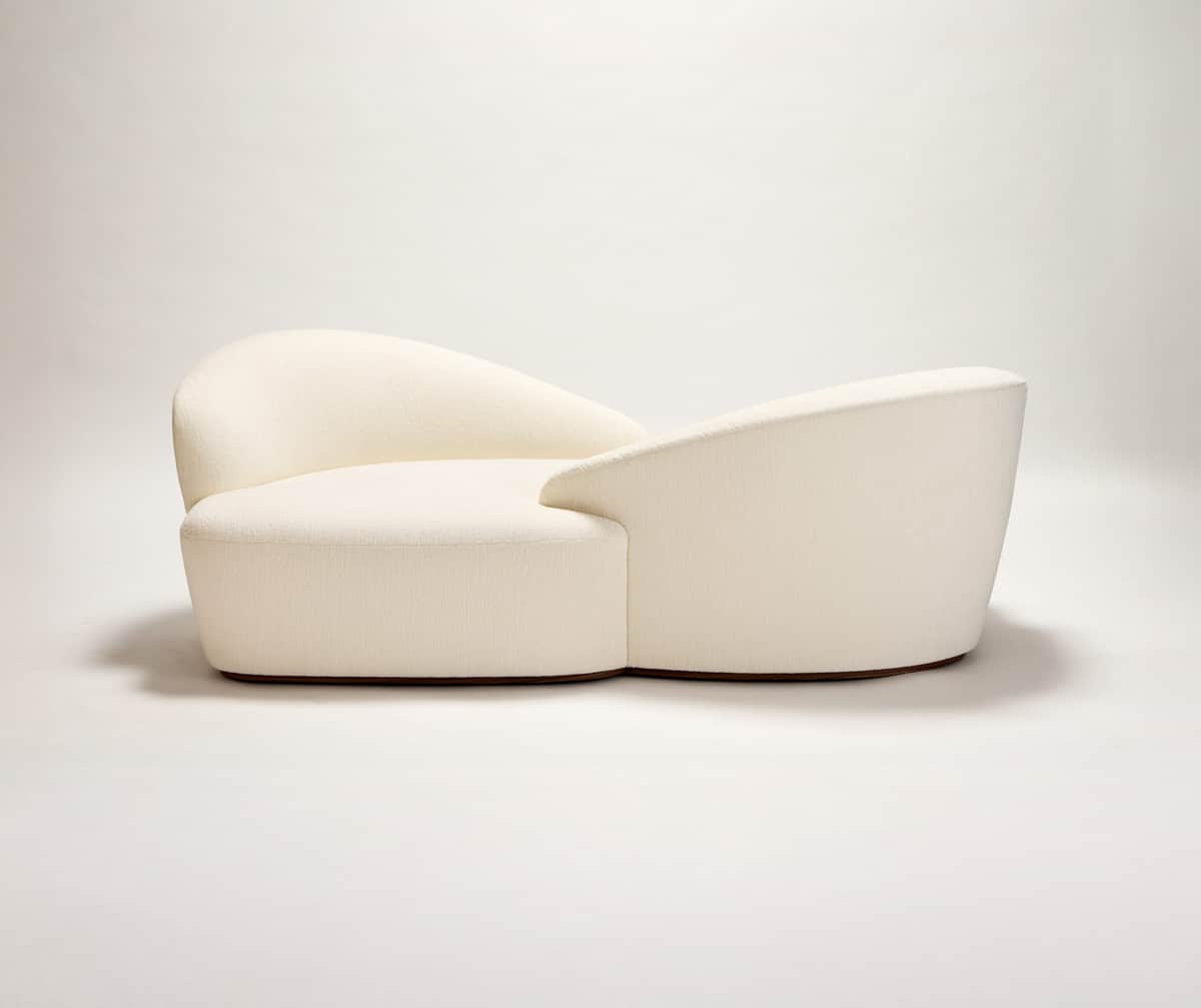 Defined by fluid, organic curves, its generous proportions and enveloping softness give the piece a strong yet welcoming presence. The design reinterprets the “You and Me” concept, transforming a traditional typology into a sculptural and functional work of art. Upholstered and set on a solid American walnut base, One 2 One offers a sensory experience, a silent dialogue between design and emotion.