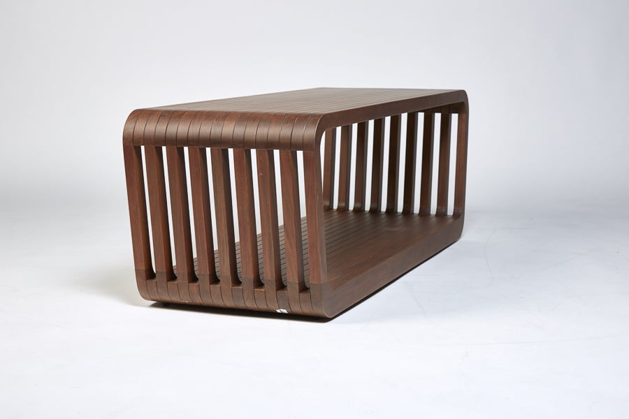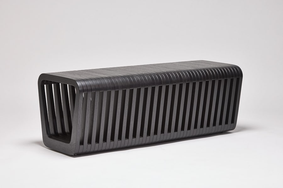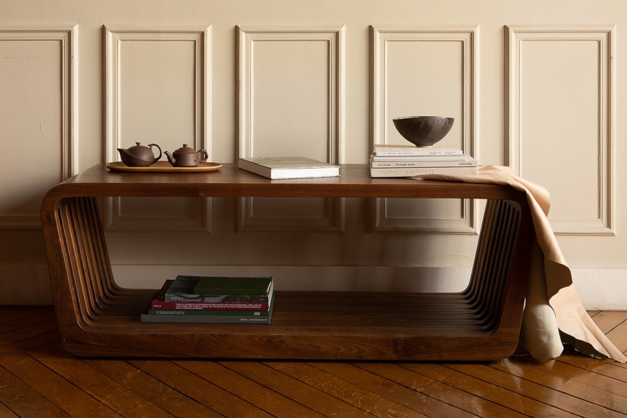 The Link collection comprises three elegant pieces, two bench versions and a stool.Compact and sculptural, the Link bench with closed sides expresses a stronger sense of enclosure. Its continuous lines and softened edges highlight the precision of the craftsmanship, while the solid wood construction gives it a confident, architectural weight. Designed as a bench or low table, it anchors interiors with calm authority and refined simplicity.