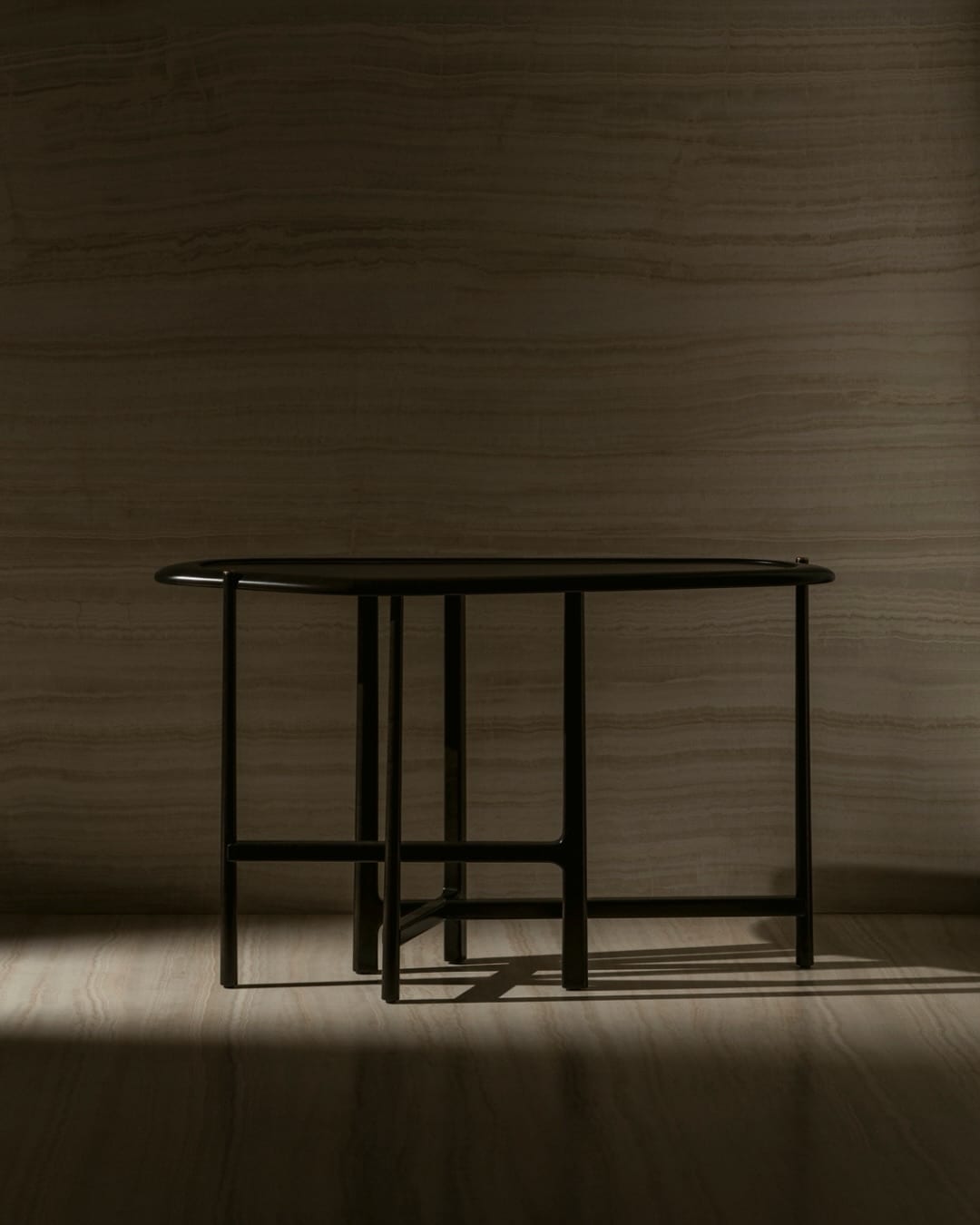 Shown in solid sycamore with a satin finish and dark patinated brass details.