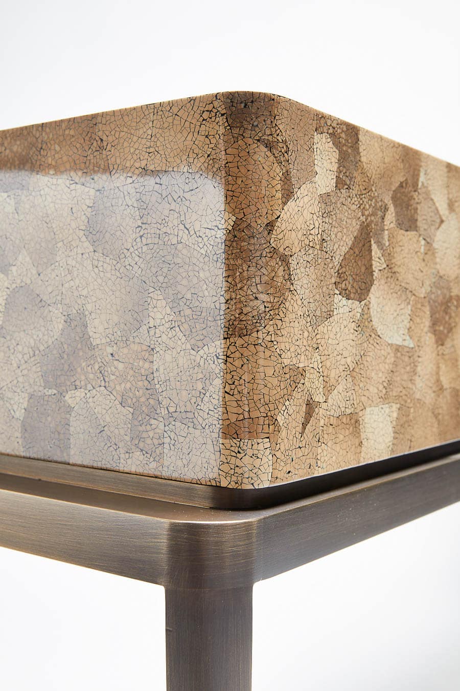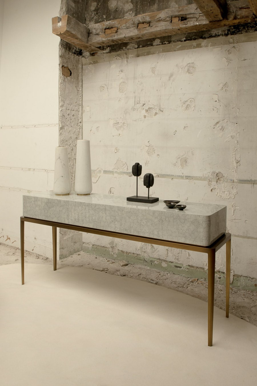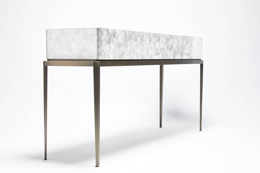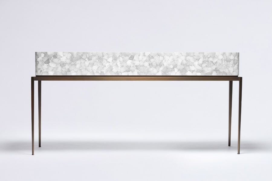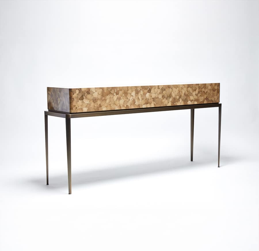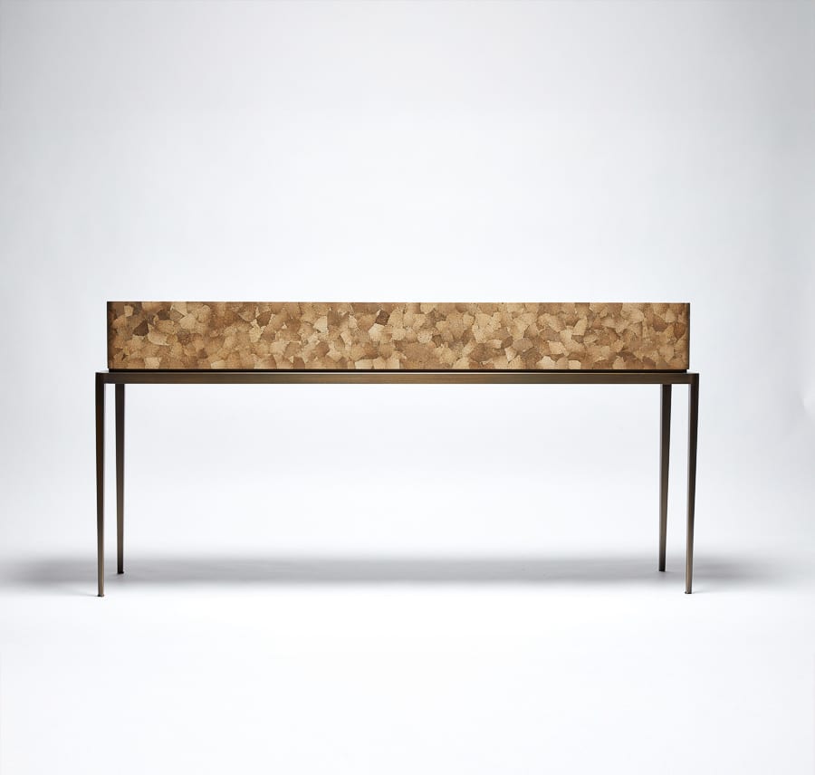 This console table is defined by a refined balance of lightness and presence. Its slender brass base, finished in bronze, introduces an elegant vertical rhythm, contrasted by the visual richness of the eggshell-covered top. Available in white or amber eggshell, this precious surface is applied fragment by fragment, like a mosaic, using a meticulous artisanal technique. Reinterpreting ancestral craftsmanship through a contemporary lens, Reda Amalou creates a piece that is both sculptural and quietly refined.
