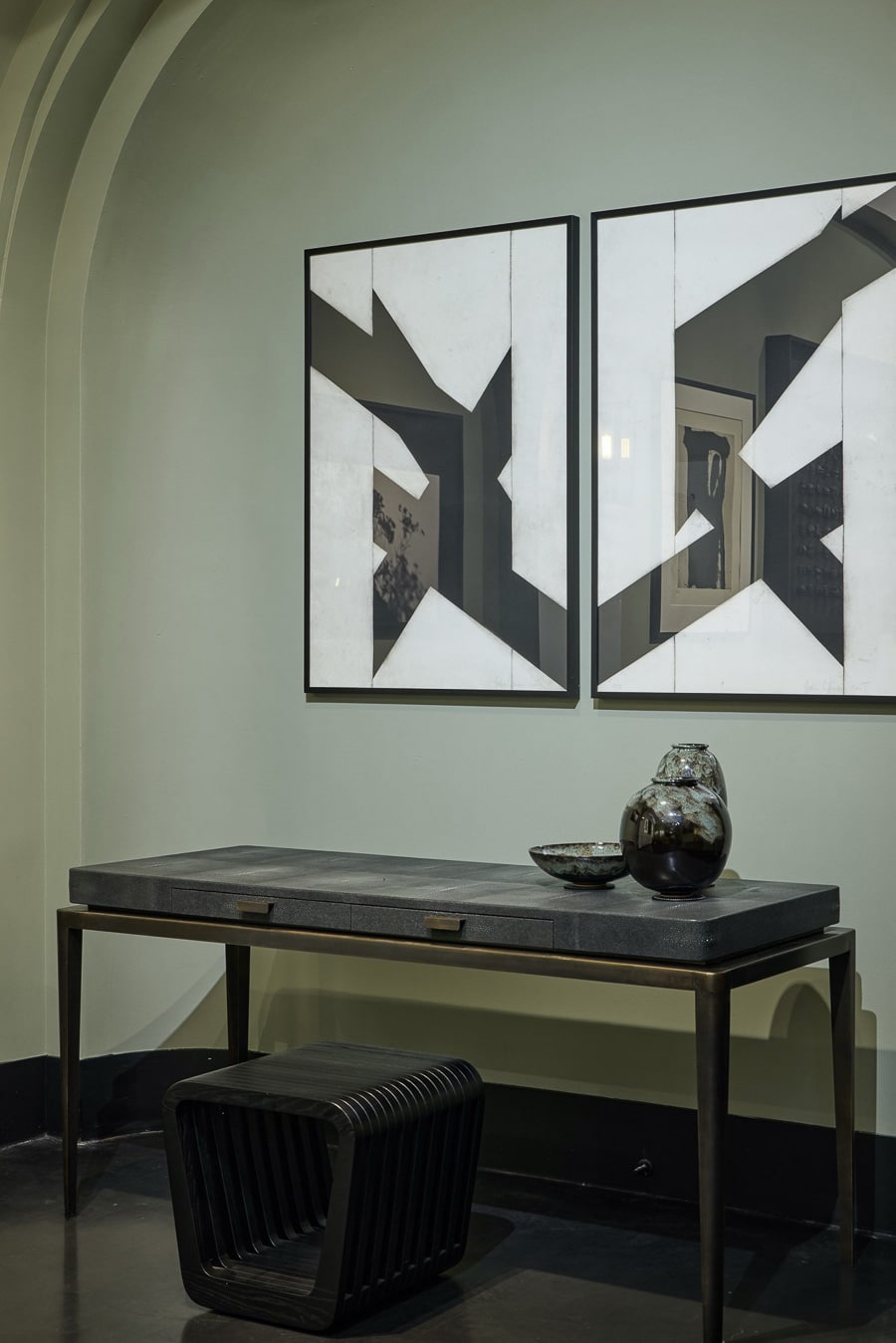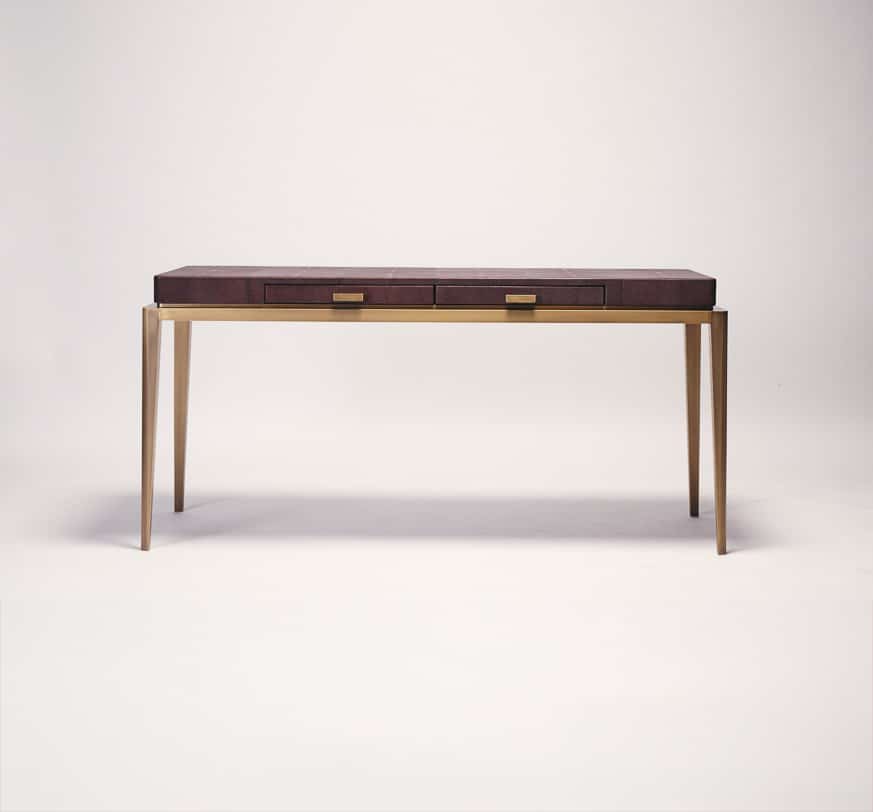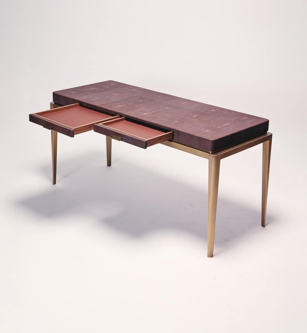 Entirely covered in shagreen leather, the Edha desk’s top introduces a rich, tactile surface, contrasted by brass legs and handles finished with a bronze patina. This dialogue of noble materials pays tribute to French craftsmanship and artisanal excellence. Featuring two drawers with interiors in American walnut and leather, Edha extends its refinement beyond the surface. Carefully studied proportions define the piece, resulting in a balanced and composed stature that feels both elegant and instinctively right.