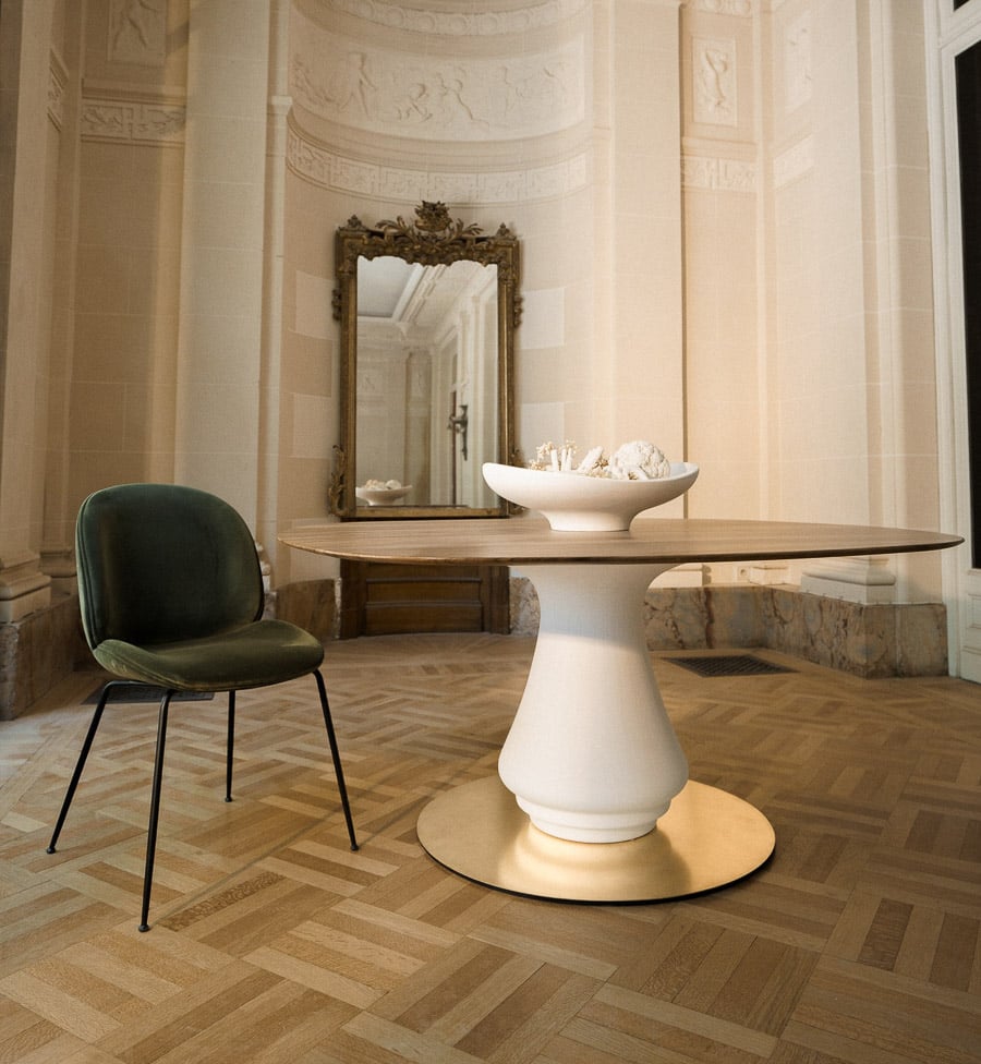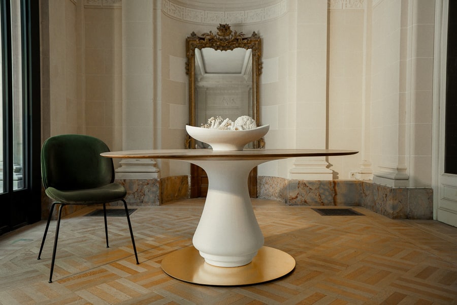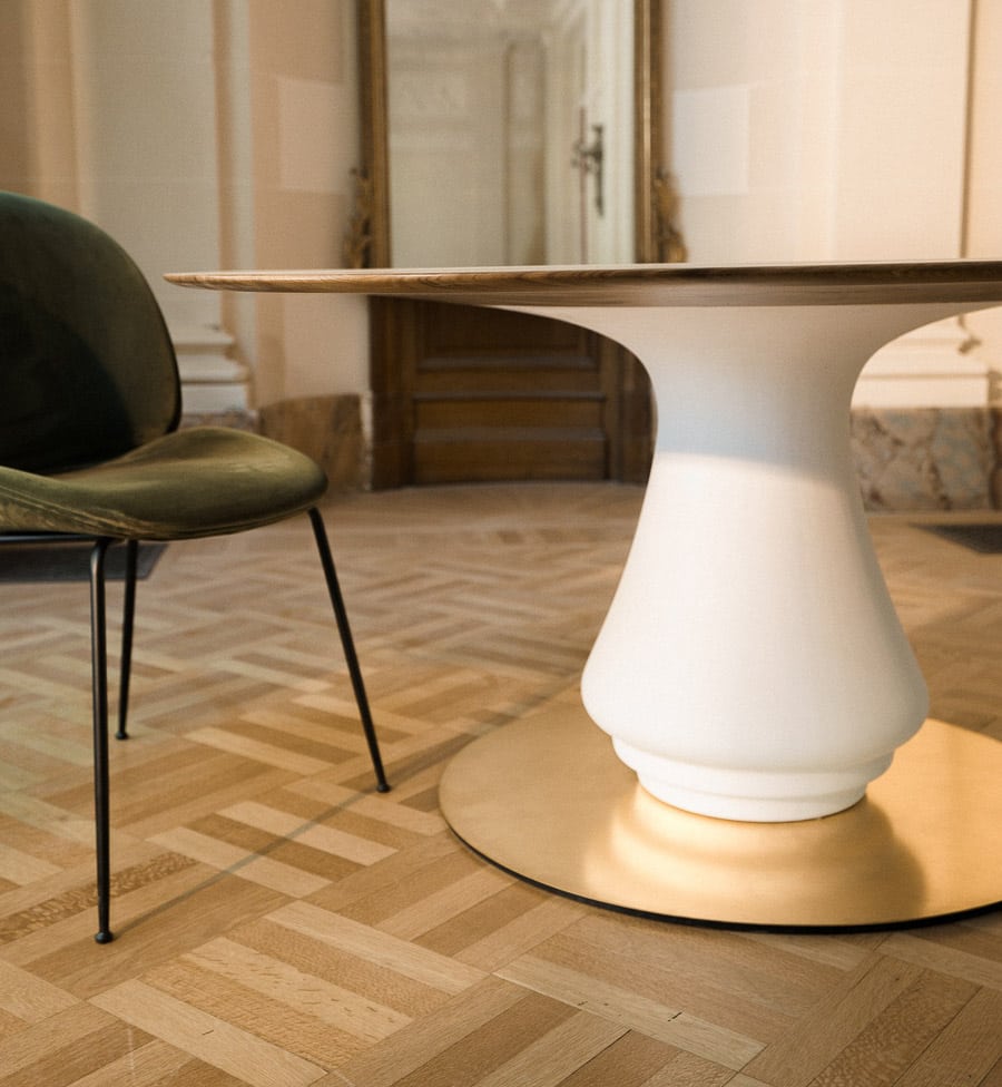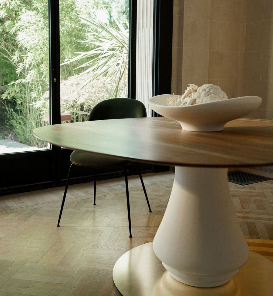 At once central and grounding, the Volute Table is conceived as an architectural presence within the living space, shaping both movement and gathering. Its sculptural base, formed in plaster, draws from the organic curves of ornamental language, unfolding into a soft, continuous gesture.