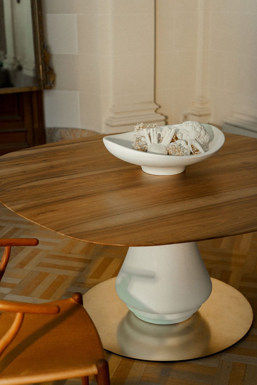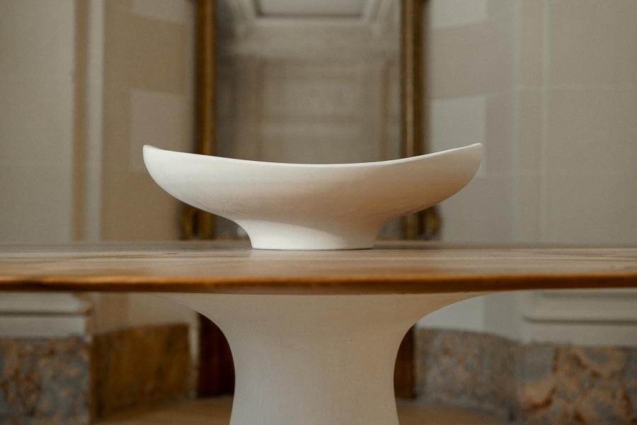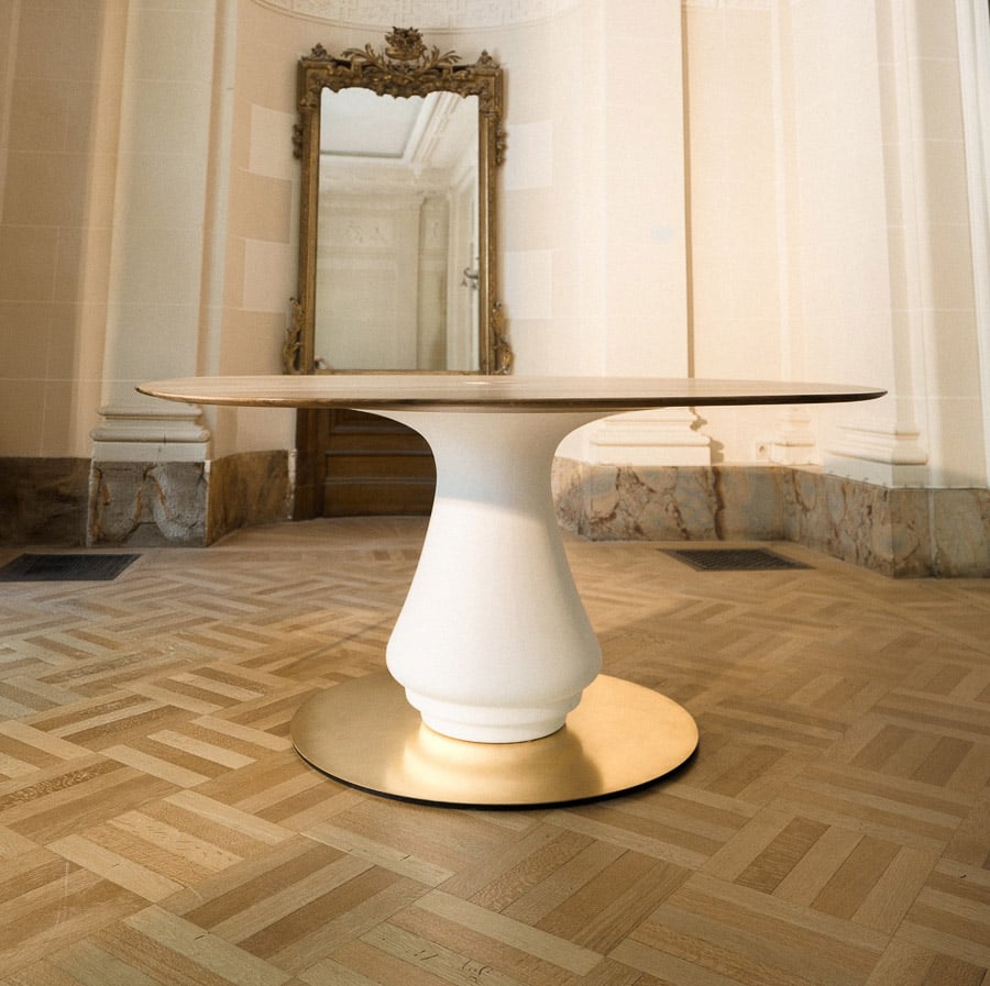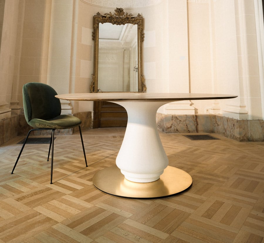 At once central and grounding, the Volute Table is conceived as an architectural presence within the living space, shaping both movement and gathering. Its sculptural base, formed in plaster, draws from the organic curves of ornamental language, unfolding into a soft, continuous gesture.