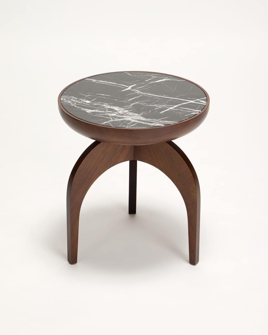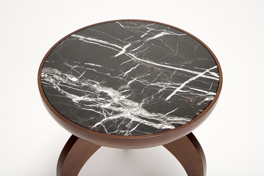 The perfect balance between power and lightness. The Babylon collection explores contrast through material and form, combining the mineral depth of Nero Marquina marble with the warmth of American walnut. Each piece reveals the marble’s unique veining, framed by softly curved wooden legs that create an impression of lightness and movement. A subtle dialogue between strength and refinement, Babylon celebrates balance, proportion, and the quiet sophistication of noble materials.