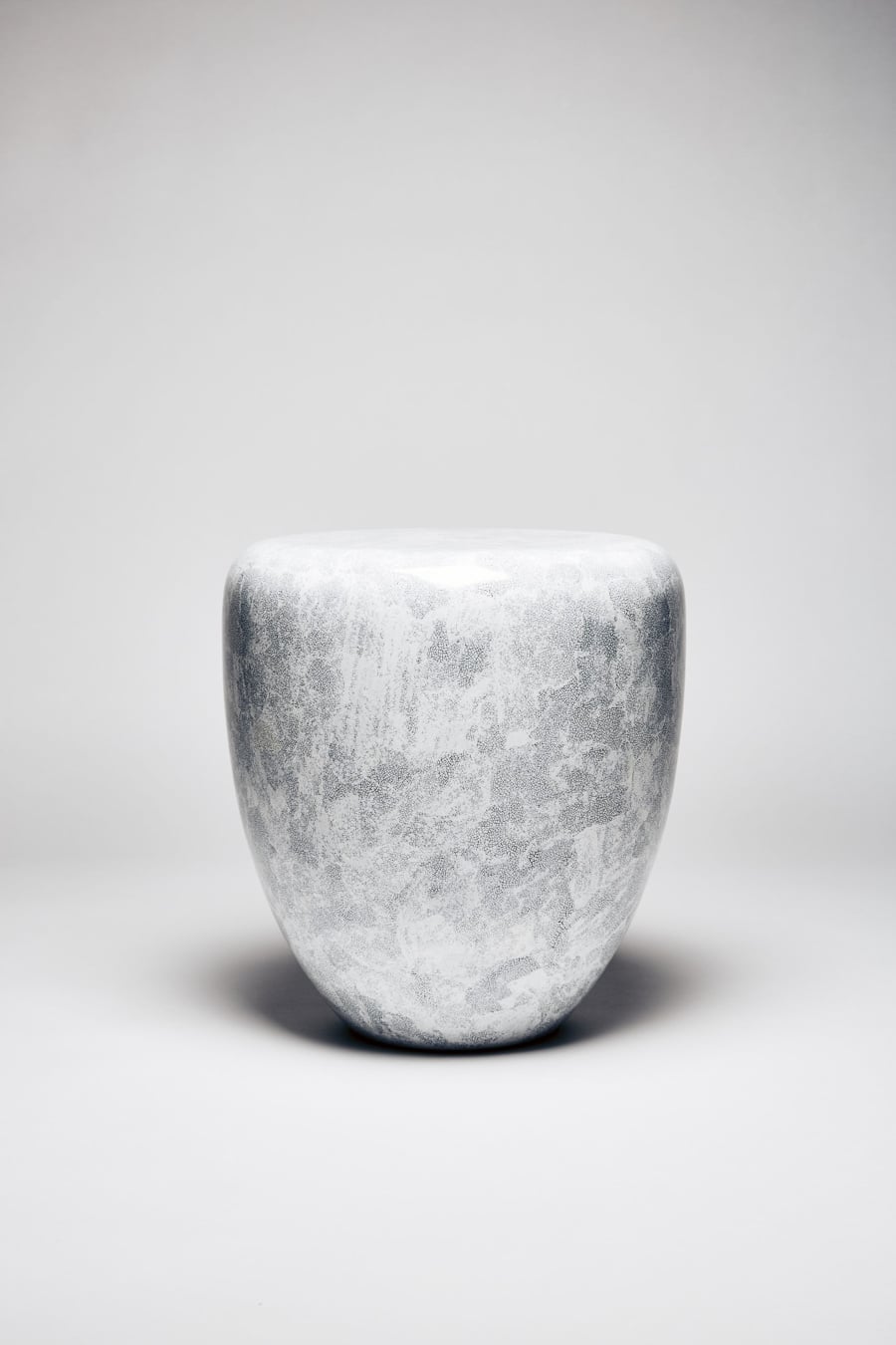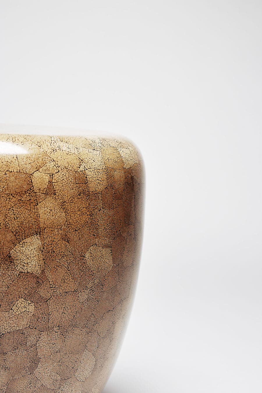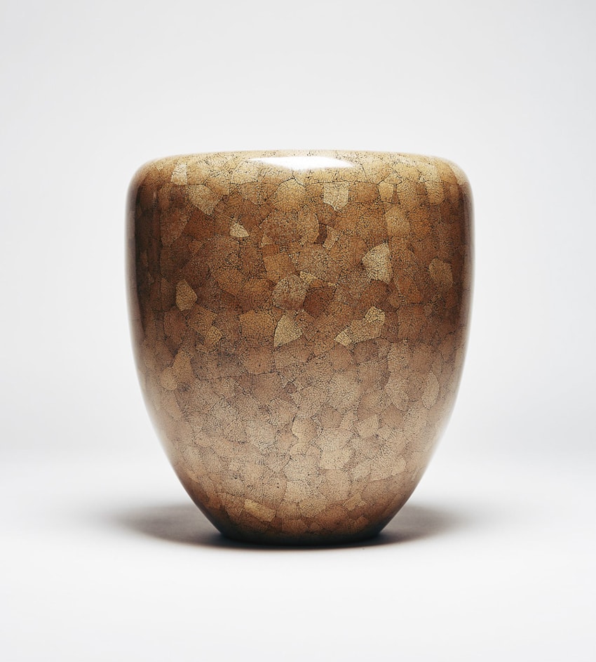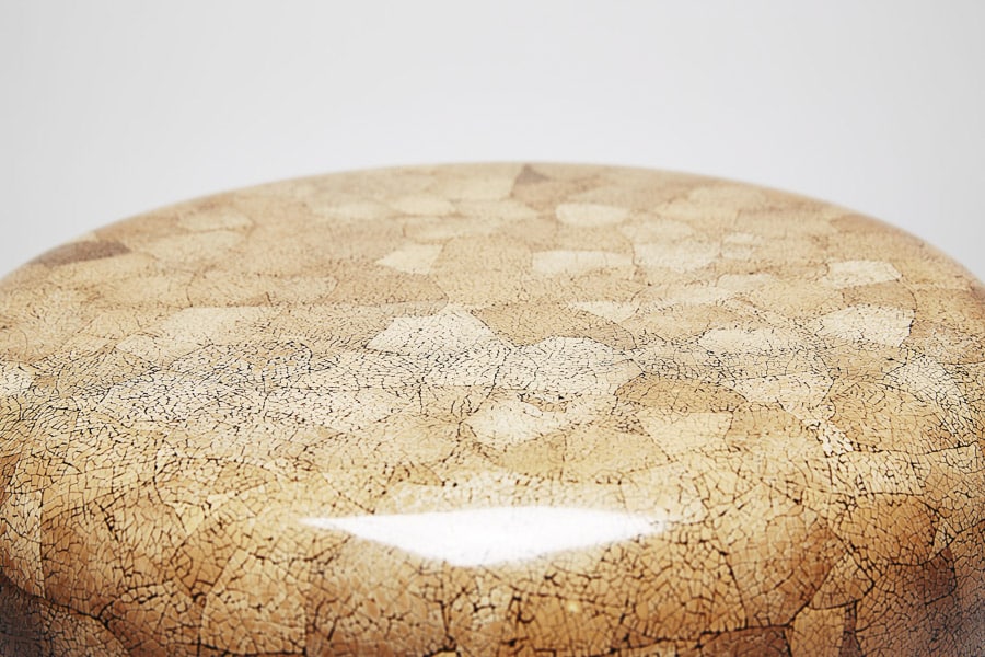 Each piece is handcrafted using a traditional lacquer technique, requiring between eighteen and twenty-one coats, meticulously sanded between each application to achieve remarkable depth and intensity. In the eggshell versions, duck egg fragments are carefully arranged by hand on a fresh layer of lacquer, forming a delicate mosaic. This artisanal process reveals a subtle, crackled pattern, rich in texture and nuance. After sanding, the surface is sealed beneath a final layer of clear lacquer, resulting in an exceptionally refined finish.