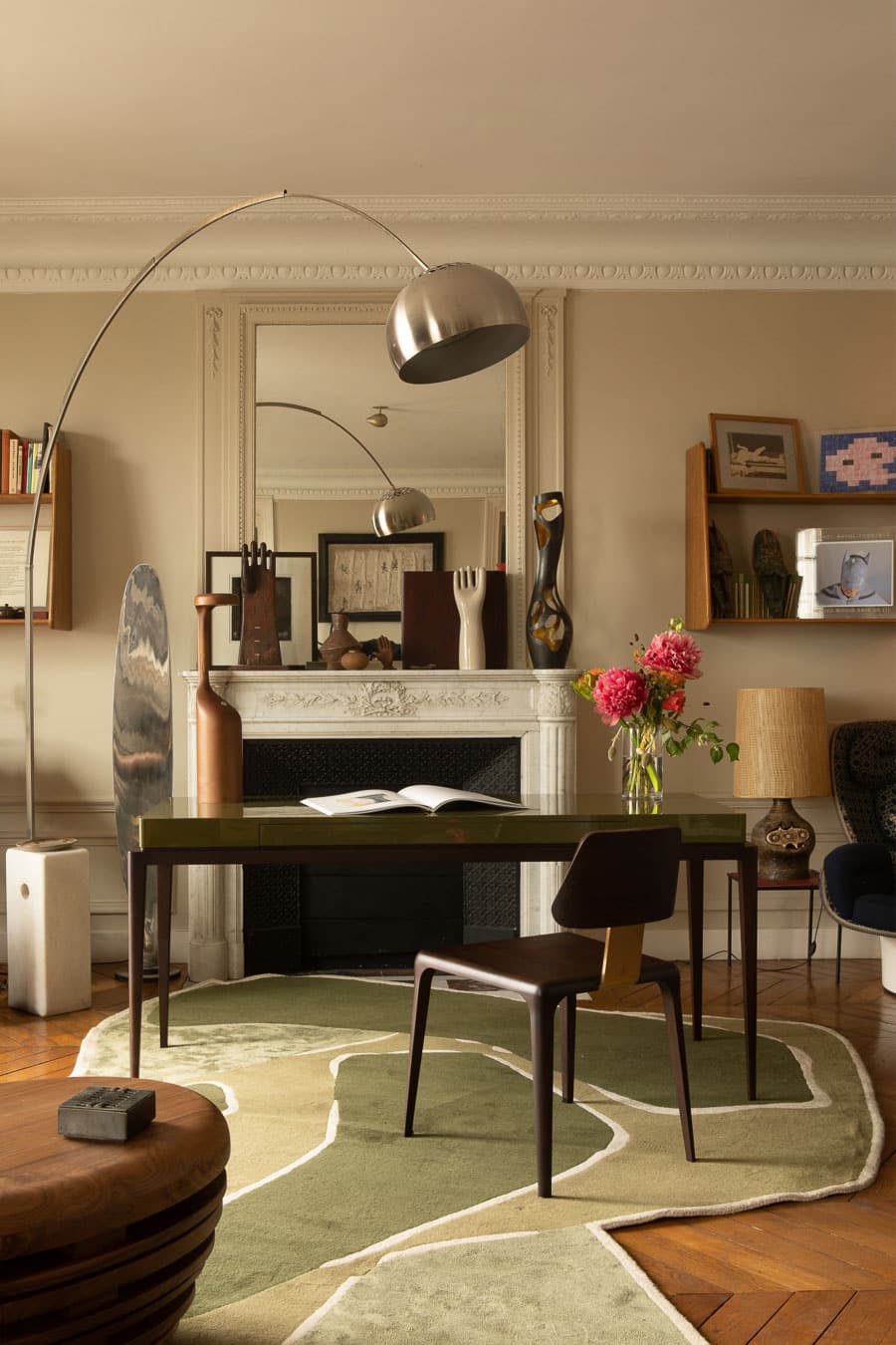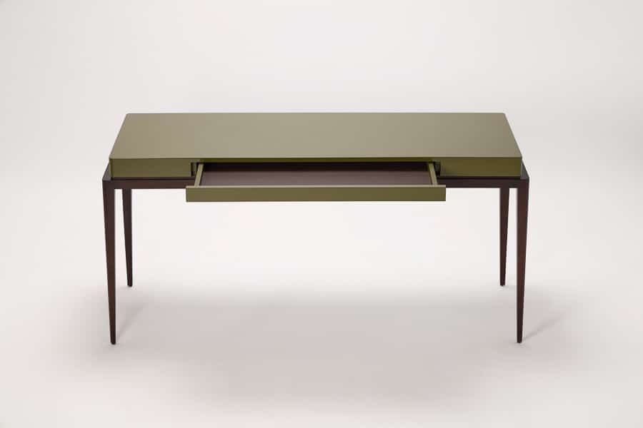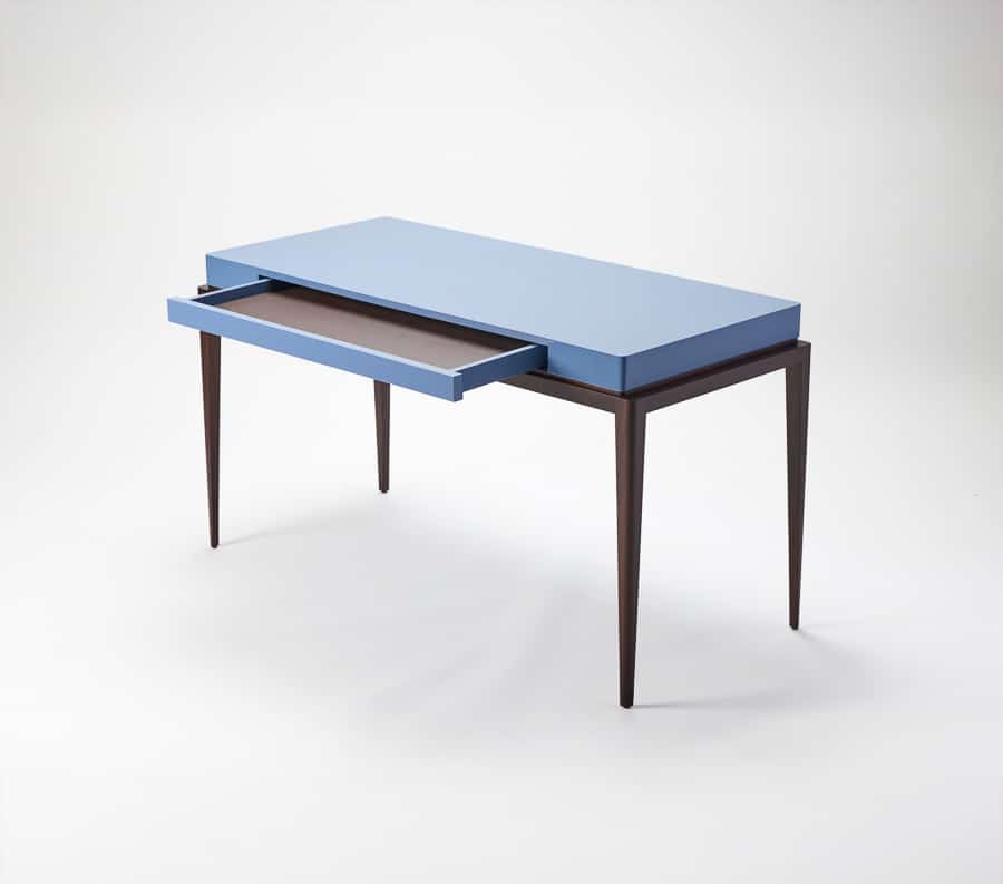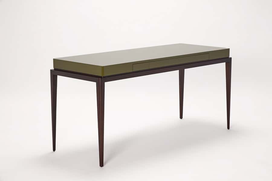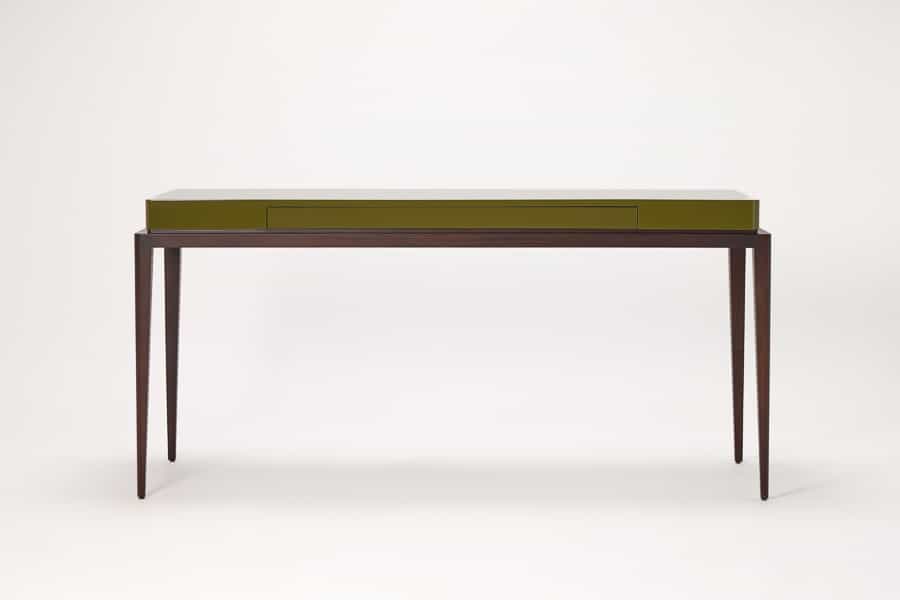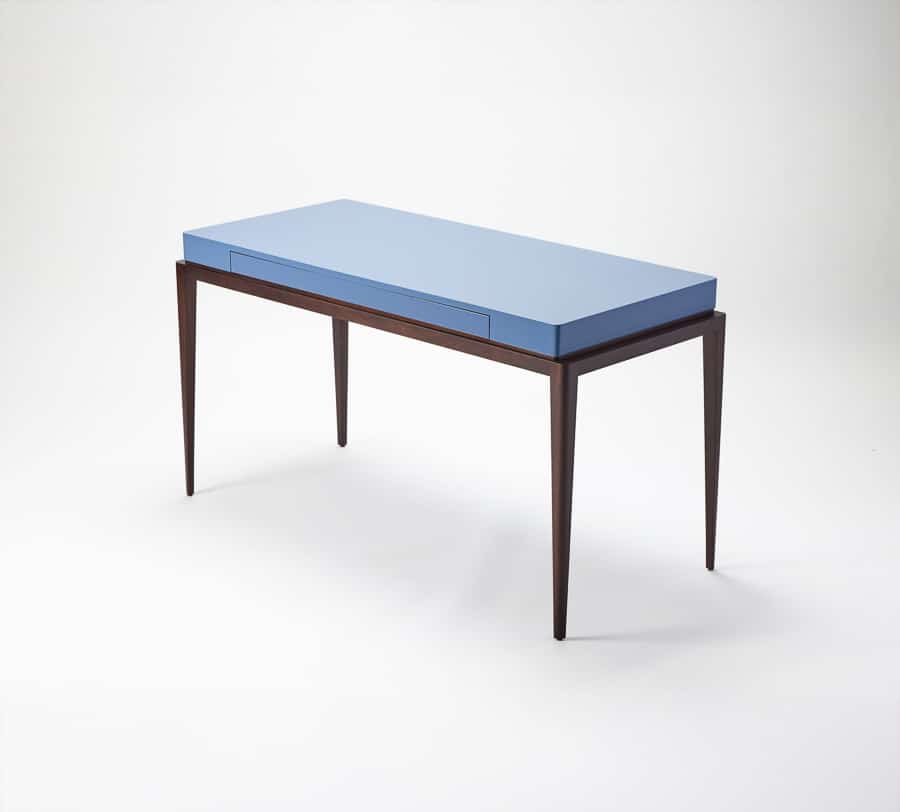 The Tara desk is defined by clarity of form and refined craftsmanship. Its hand-lacquered top, available in glossy or matte finishes, conceals an integrated drawer lined in leather, combining elegance with discreet functionality. The purity of the surface highlights the depth and precision of the lacquer work, while the contrast with the solid walnut or black-stained oak base creates a composed and harmonious balance. Rounded forms and restrained lines give the desk a sophisticated yet minimalist presence, unmistakably bearing the designer’s signature.