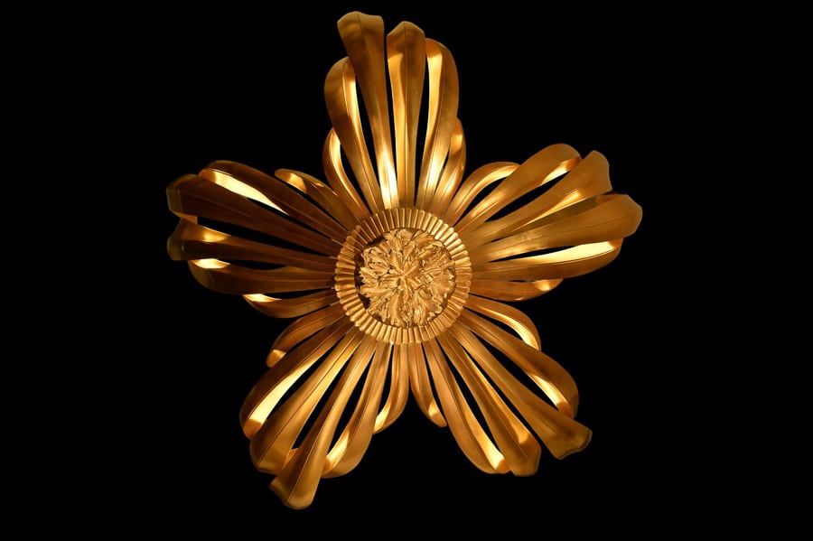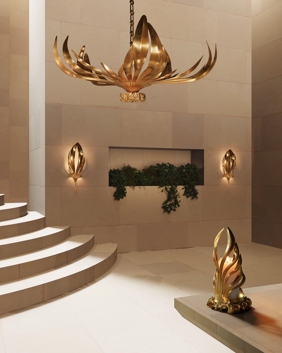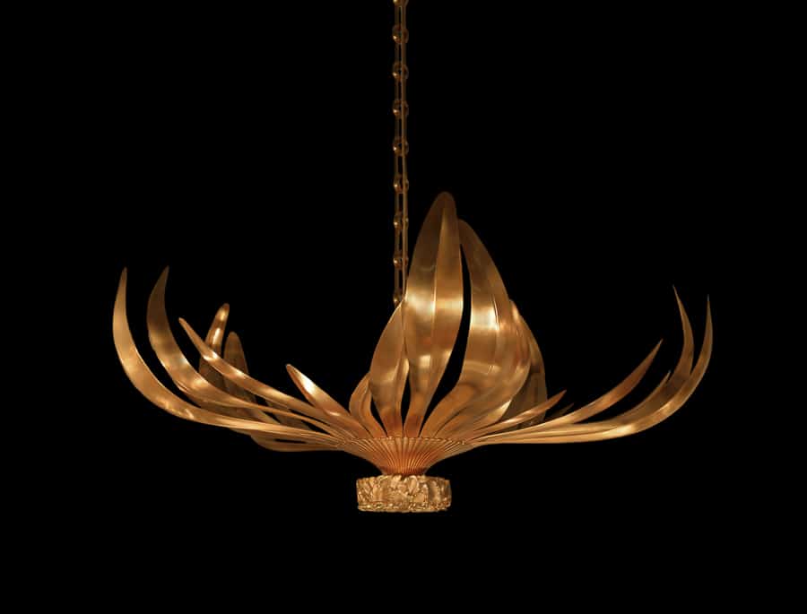 The Palmette Chandelier unfolds like a living form in motion, its bronze elements radiating outward with organic fluidity. Gilded in 24K gold and animated by integrated LED lighting, the piece celebrates nature as a source of rhythm, light, and ornament. Handcrafted by master artisans, bronze becomes weightless, sculpted by light and transformed into a poetic statement of balance and movement.